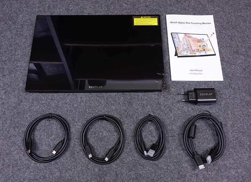 그리고, 기본 제공으로 또하나 포함된 구성품이 있는데, 바로 스타일러스 펜(Stylus pen)입니다. 앞서 시작에서 언급했듯이 이번 P16 MAX PRO 포터블 모니터에 새롭게 추가된 기능은 바로 스타일러스 펜입니다. 쉽게 말해 터치 지원이죠. 기본 제공되는 스타일러스 펜도 별도의 박스 포장에 구성품은 스타일러스 펜, 교체용 펜촉 및 분리 도구, 충전케이블, 제품 설명서로 이루어져 있습니다. 그리고, 개봉시 모니터에는 보호비닐이 부착되어 있는데, 사용전에 제거하라는 문구에 따라 제거하면 됩니다.