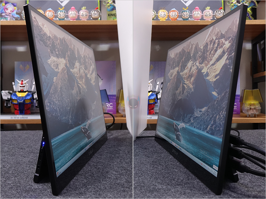 그럼, 본격적으로 제우스랩(Zeuslap)의 P16 MAX PRO 포터블 모니터를 살펴보면, 크기는 16인치로 뒤에서 확인하겠지만, 화면 비율은 기존 P16 모델과 마찬가지로 16:10으로 최대 2560x1600 해상도를 지원합니다. 조금 아쉬운 점이라면 화면 반사코팅이 적용되어 있지않아 빛반사가 있으며, 밝은 곳에서 보면 화면 테두리 베젤을 확인할 수 있는데, 위와 좌우는 각각 5mm, 6mm 정도, 아래에는 약 18mm정도 베젤 두께를 가졌죠. 그리고, 화면 아래 중앙부분에는 ZEUSLAP 로고를 새겨놨습니다.