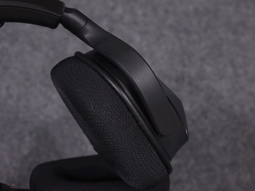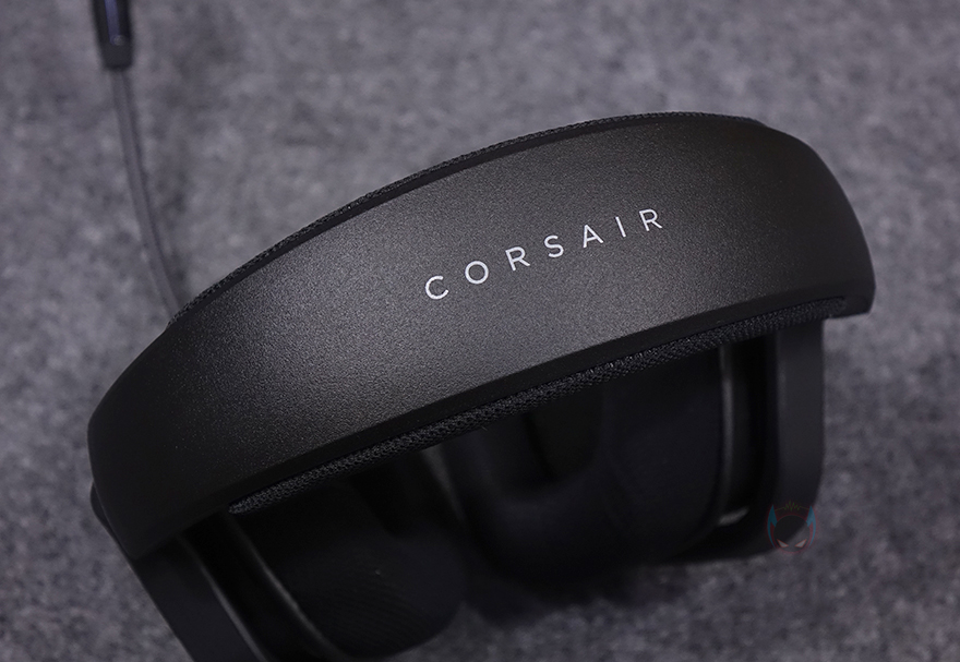 좀 더 자세히 살펴보면, 헤어밴드 부분 바깥쪽에는 심플하게 CORSAIR 로고를 새겨놨으며, 안쪽에는 편안한 착용감을 위해 패브릭 마감의 쿠션을 적용했습니다. 밴드는 당연히 길이 조절이 가능하고 최대 약 38mm 정도 늘릴 수 있으며, 단계별 조절이 있는 게 아니라 견고하면서도 스무스하게 조절할 수 있게 길이조절을 적용했습니다. 밴드 안쪽에는 좌우 구분 표시를 해놨죠. 그리고, 밴드에서 이어-컵으로 이어지는 연결부는 착용에 따라 자연스럽게 각도조절이 되도록 틸트를 적용했습니다. 또한, 90˚도 회전도 가능해서 보관환경에 따라서 이어-컵 조절을 하면 됩니다.