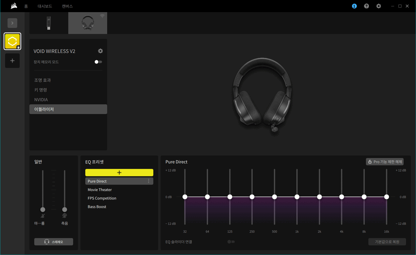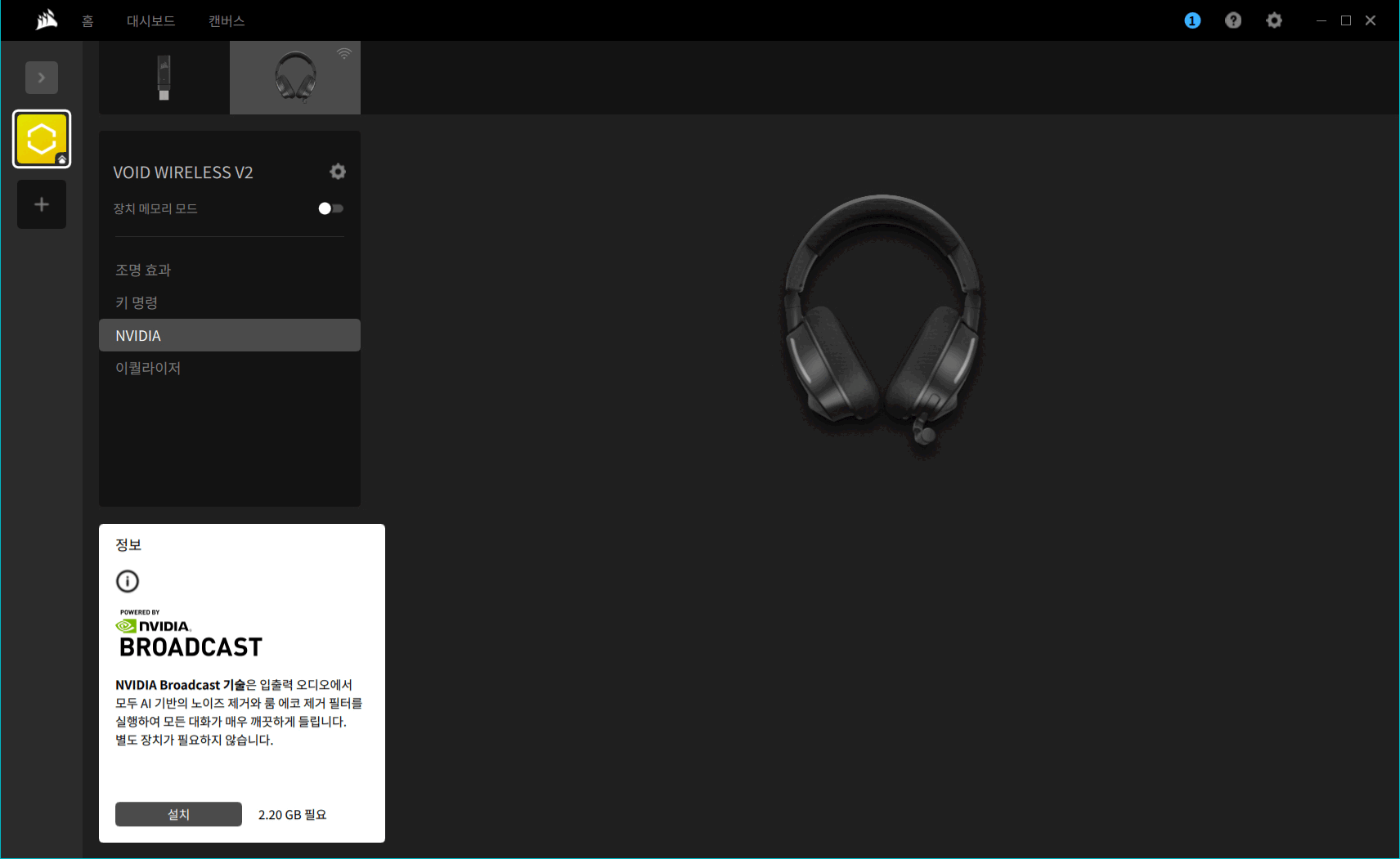 기본 화면에서 VOID v2 무선 게이밍 헤드셋 속성으로 들어가 보면, 조명효과/키 명령/NVIDIA/이퀄라이저 메뉴를 추가로 확인할 수 있는데, 그전에 바로 위에 장치메모리 모드 활성화 버튼을 확인할 수 있습니다. 장치메모리 모드는 흔히 말하는 온보드 기능이라고 생각하면 되는데, iCUE 프로그램과 상관없이 RGB 설정 및 VOID v2 무선 게이밍 헤드셋의 설정값 즉 프로파일을 기기에 저장해서 작동되도록 하는 모드입니다. 그리고, 조명효과 메뉴로 들어가면, 앞서 확인한 VOID v2 무선 게이밍 헤드셋 이어-컵 부분의 RGB 라이트닝효과를 다양하게 설정할 수 있는데, 기본 제공되는 모드 즉 프리셋 메뉴에서는 총 8가지 모드를 제공해주고 있으며, 모드에 따라서 색상, 방향, 속도조절을 할 수 있고, LED부분도 상/하단 따로 선택하거나 전체로 선택해서 설정할 수 있습니다. 그리고, 사용자 정의와 조명링크 메뉴로 들어가면 더 많은 모드 설정을 할 수 있어서 RGB 효과는 사실상 사용자가 원하는 대로 할 수 있다고보면 됩니다. 키 명령 메뉴는 왼쪽 이어-컵에 있는 볼륨조절 다이얼을 버튼 기능으로 활용할 수 있는 설정으로 '스크롤 누르기' 메뉴에서 마우스 오른쪽 버튼을 누르면 기능을 설정할 수 있는 다양한 메뉴들이 나옵니다. 이 중 원하는 기능을 선택해서 설정하면, 볼륨조절 다이얼을 눌렀을 때 해당 기능이 작동됩니다. 참고로, 아무런 설정이 없는 상태에서의 다이얼 버튼을 누르면 마이크 On/Off 기능입니다. NVIDIA 메뉴는 앞서 언급했듯이 사용자 시스템에 Nvidia의 지포스 RTX 그래픽카드를 사용하면, NVIDIA의 일명 노이즈캔슬링 기능인 브로드캐스트(Broadcast) 기능을 사용할 수 있습니다. NVIDIA 메뉴에서 바로 설치를 진행할 수 있고, 설치 후 기능을 바로 사용할 수 있으며, 마이크의 주변 소음 및 공간 에코 제거 기능을 활성화할 수 있고, 마이크 실시간 녹음을 통해 마이크 상태를 확인할 수 있으며, 강도와 볼륨조절도 할 수 있습니다. 이퀄라이저 메뉴에서는 총 4가지 사운드 모드를 기본 제공하고 있으며, 각 모드에 설정된 주파수 대역값을 사용자가 원하는대로 설정할 수 있고, 또는 아예 사용자가 커스텀으로 설정으로 사운드모드에 추가할 수 있습니다.