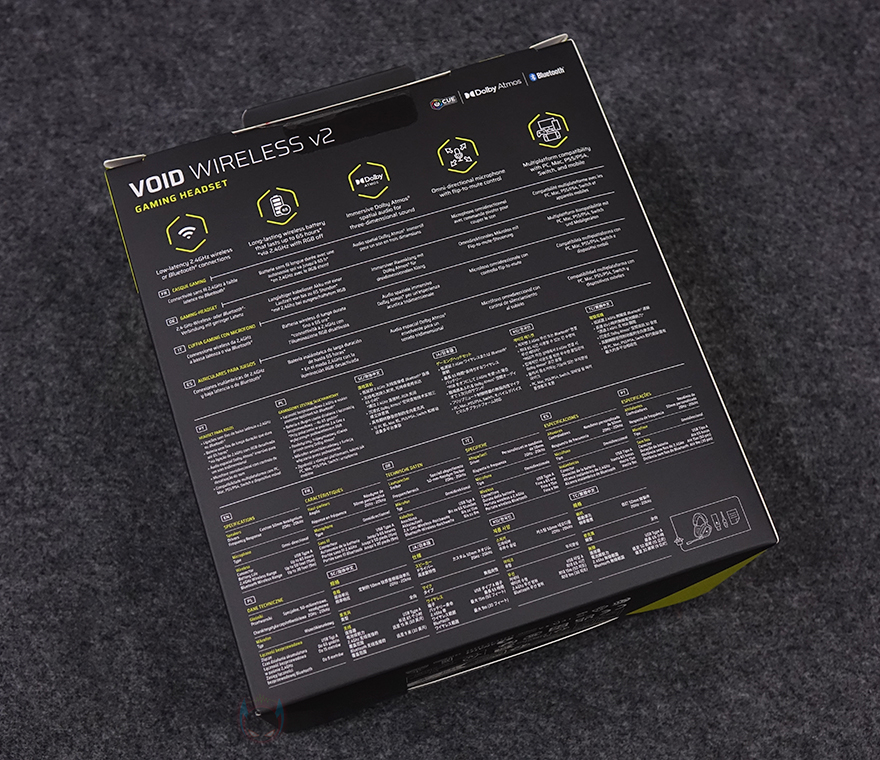 반대쪽 측면에는 제품의 주요 특징을 표기해놨는데,표기해 놨는데, 무선 2.4G/블루투스에서의 짧은 지연시간, 긴 지속시간 배터리, 돌비 애트모스 공간 오디오 지원을 언급하고 있습니다. 아래에는 한 번 호환 플랫폼 지원 표기를 확인할 수 있죠. 박스 후면에도 방금 언급했던 주요 특징과 추가로 전방향 마이크 및 플립형 음소거, 멀티 플랫폼 지원을 다국적 언어로 표기해 놨는데, 한국어도 포함되어 있습니다. 그리고, 아래에 제품의 기본 사양 표기도 다국적 언어로 한국어가 포함된 표기를 추가로 확인할 수 있죠. 스피커, 마이크, 무선 각각 분류해서 표기해 놨습니다.