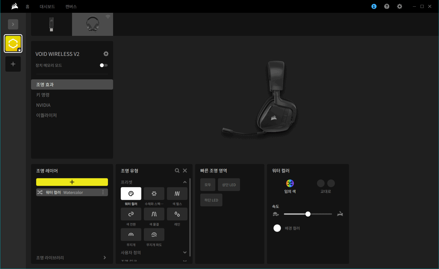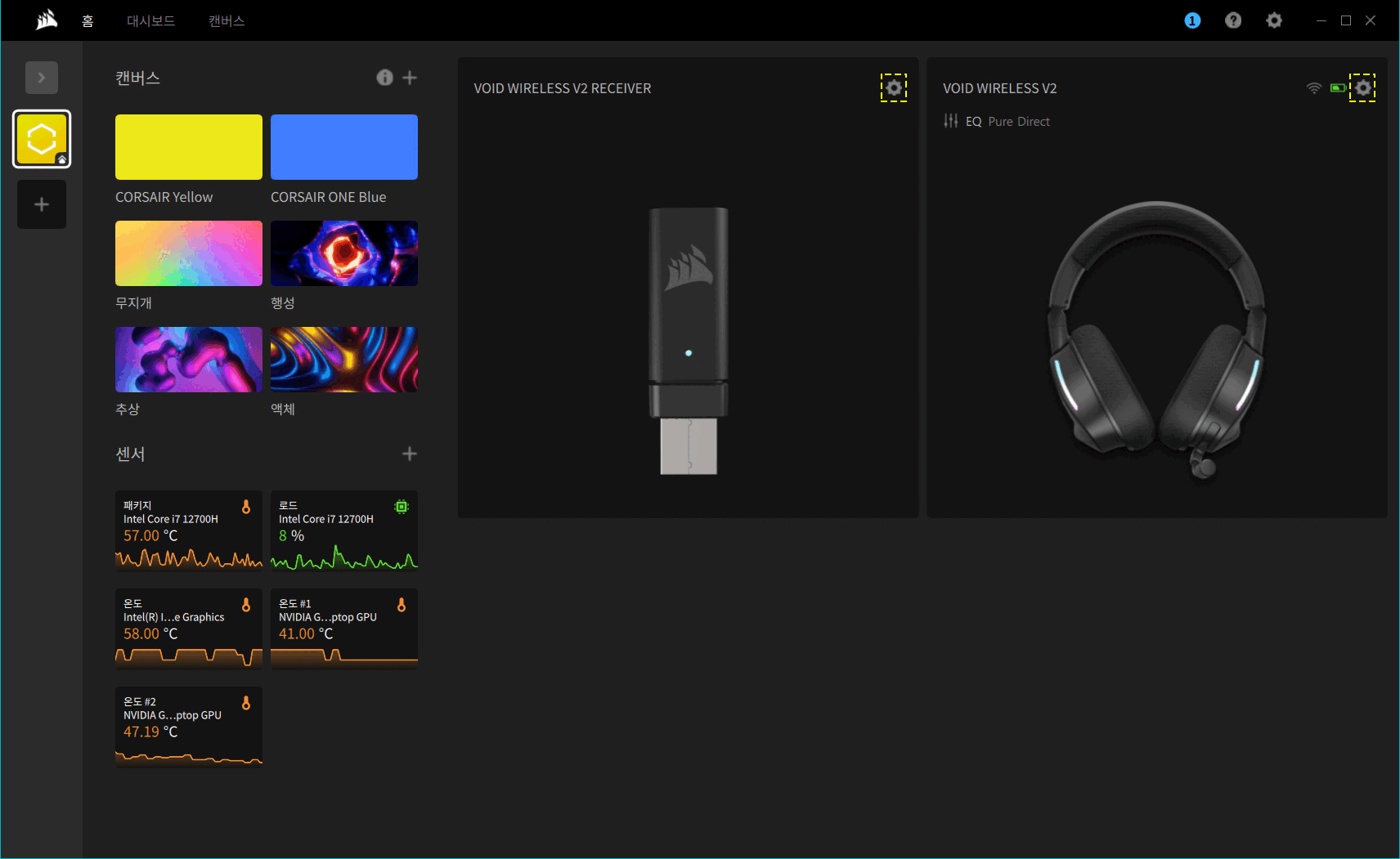 앞서 언급했듯이, VOID v2 무선 게이밍 헤드셋은 커세어의 iCUE 통합 소프트웨어를 지원하고 있어서, 사용자가 다양한 기능을 설정할 수 있습니다. 일단, iCUE 프로그램을 설치하면, VOID v2 무선 게이밍 헤드셋과 무선 2.4G 동글이 수신기가 프로그램에서도 인식된 걸 확인할 수 있으며, iCUE 기본 화면에서 대시보드와 캔버스 메뉴로 들어가면 시스템 모니터링과 기본 RGB 모드를 선택할 수 있고, 프로그램 화면 맨 오른쪽 상단에 설정버튼을 누르면 프로그램 기본 설정 및 업데이트, 타사 제품 및 외부 프로그램 플러그인 및 통합 설정을 다룰 수 있습니다.