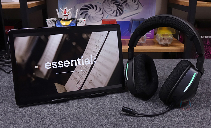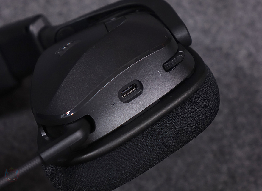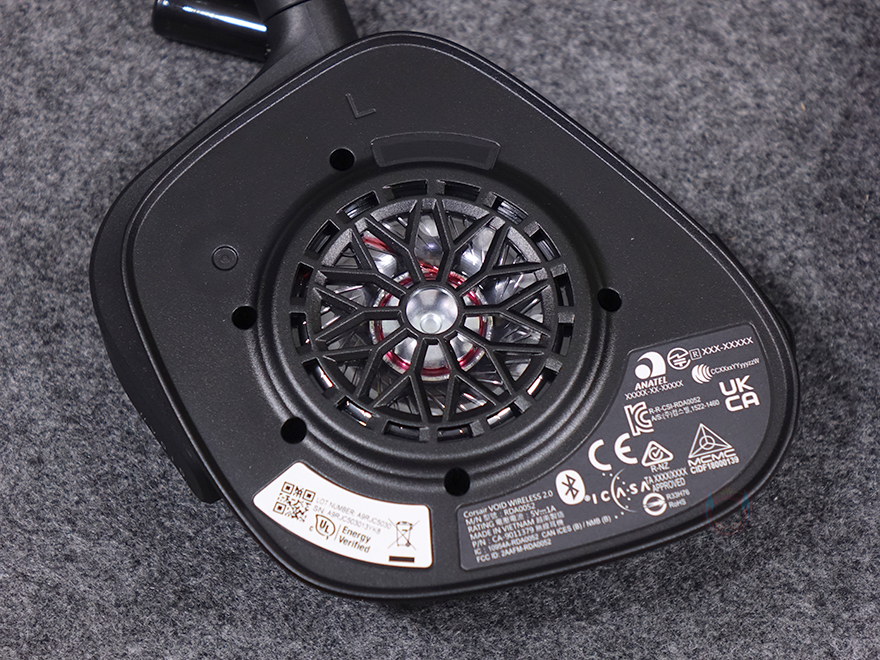 이어-컵(Ear-cup) 부분을 살펴보면, 바깥쪽에는 네임플레이트형식으로 커세어 로고를 적용해 놨으며, 측면 그러니깐 착용 시 전방향 쪽에는 RGB 라이트닝 효과를 볼 수 있게 디자인이 적용되어 있는데, 커세어의 통합 소프트웨어 iCUE를 통해 다양한 조명모드 효과를 적용할 수 있습니다. 오른쪽 이어-컵에는 특별함이 없고, 왼쪽 이어-컵에는 로고 옆에 버튼이 2개 배치되어 있는데, 하나는 전원버튼, 나머지 하나는 연결모드 전환 버튼입니다. 착용 상태에서도 손쉽게 버튼 구분이 되도록 표면에 디자인을 따로 적용했죠. 그리고, 아랫부분에는 볼륨조절 다이얼이 배치되어 있으며, 이어-컵 연결부에 VOID 모델명도 포인트로 주고 있는 걸 확인할 수 있죠. 그리고, 다이얼 옆에는 USB 충전케이블과 연결되는 USB 타입 C포트가 배치되어 있으며, 왼쪽 이어-컵에는 마이크가 적용되어 있는데, 마이크는 플립형 그러니깐 접이식으로 사용하지 않을 때는 밴드방향 쪽으로 올려서 좀 더 편리하게 사용할 수 있게 해 줍니다. 또한, 마이크를 접었을 때 자동으로 음소거가 되도록 했죠. 참고로, Nvidia 지포스 RTX 그래픽카드를 사용하면, Nvidia의 일명 노이즈캔슬링 기능인 브로드캐스트를 사용할 수 있습니다. 마이크는 당연히 단일지향성이며, 착용하는 사용자에 따라 자유롭게 구부려서 위치조절할 수 있는 플렉시블 방식이죠.