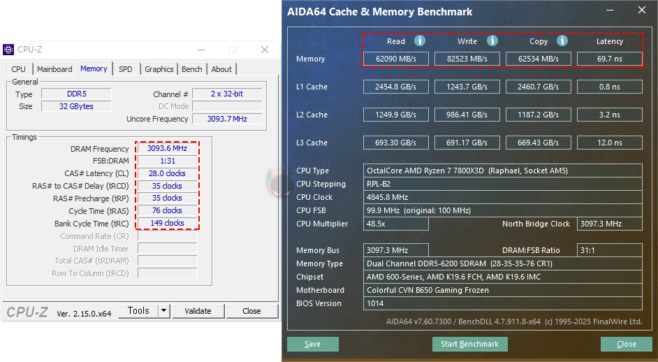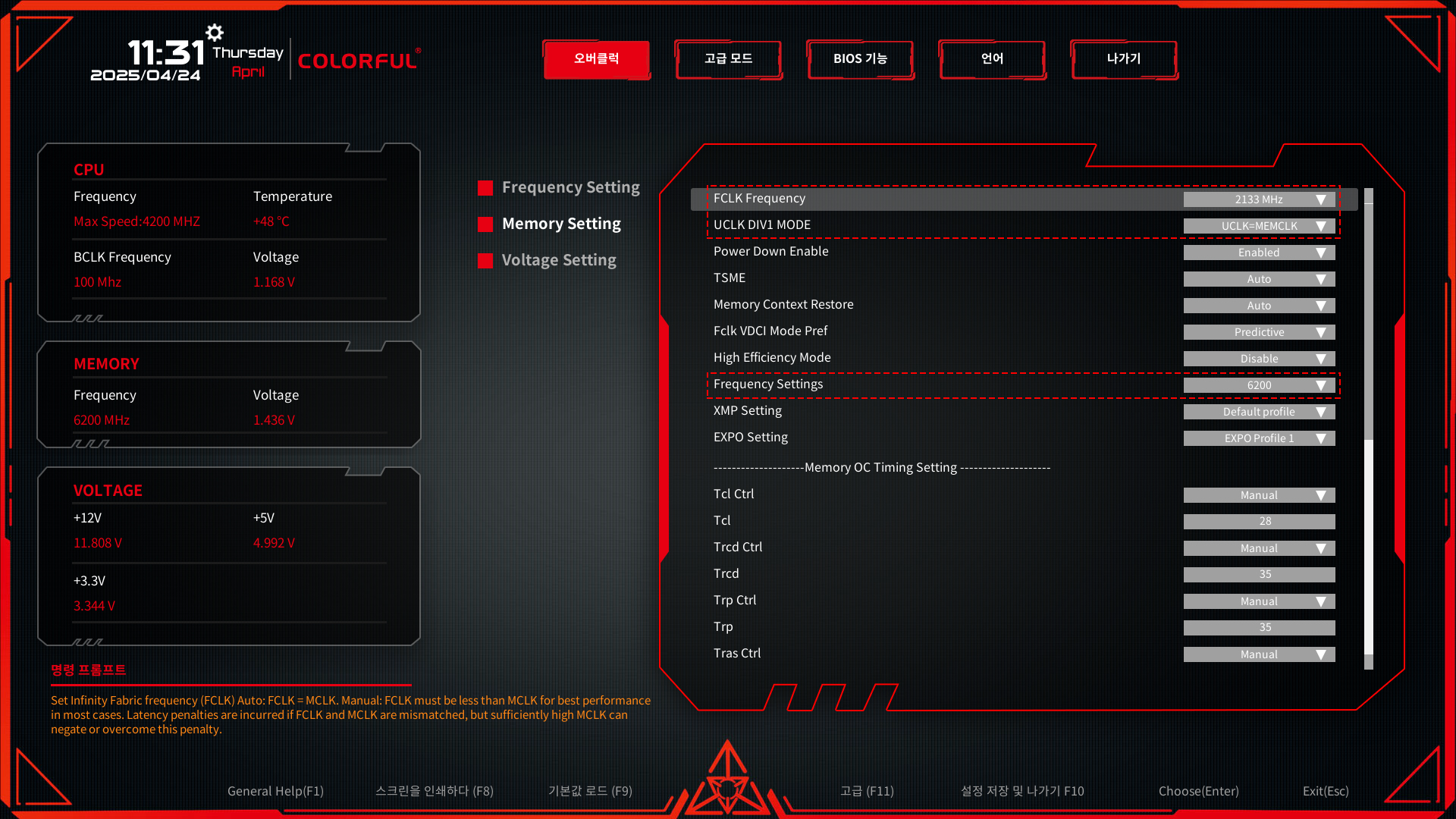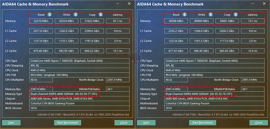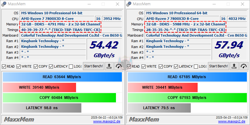 킹뱅크 DDR5-6000 CL28 메모리는 앞서 CPU-Z에서 정보를 확인했듯이 SK Hynix 모듈을 사용하고 있습니다. 킹뱅크 알리익스프레스 공식스토어에 등록된 제품 정보를 참고하면, 하닉스 A다이(Hynix A-Die)가 사용된걸로 확인할 수 있죠. 따라서, 사용자가 좀 더 빠른 속도를 원한다면 수동적으로 추가 오버클럭을 시도해 볼 수 있습니다. 다만, XMP/EXPO 설정으로 램 타이밍값이 CL28로 이는 현재 DDR5 메모리에서 가장 낮은 타이밍값입니다. 여기에 메모리 전압도 최대 안전전압인 1.45V를 적용하고 있죠. 그래서, 높은 클럭만 고집하는 게 아니라 레이턴시 고려하는 사용자라면 사실상 클럭속도만 조절하면 되는데, AMD CPU 사용자라면 인피니티 패브릭 클럭(FCLK) 설정과 메모리 클럭:메모리 컨트롤러 클럭(UCLK:MCLK) 동기화 설정을 함께 해줬을 때 좀 더 좋은 결과를 얻을 수 있습니다. 실제로, 킹뱅크 DDR5-6000 CL28 메모리를 XMP/EXPO 프로파일 적용상태에서 추가로 클럭(6200MHz)만 좀 더 올리고, FCLK(2133)과 UCLK:MCLK를 설정한 상태에서 테스트를 해보면 XMP/EXPO 설정보다 레이턴시(Latency)가 더 빨라진 것을 확인할 수 있죠. 물론, 램 타이밍이 중요하지 않다면, 타이밍 값을 Auto로해서 클럭을 높이면 더 높게 올라가지만, 레이턴시가 높아지기 때문에 최적의 성능은 아닙니다.