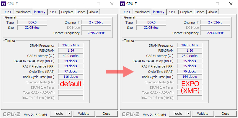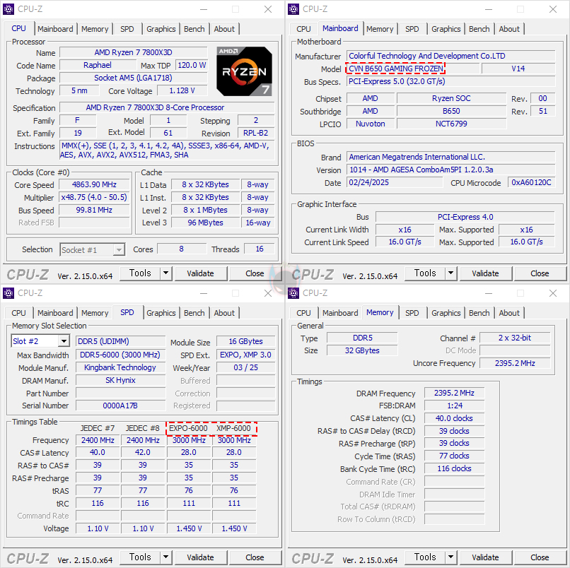 킹뱅크(KingBank) DDR5-6000 CL28 메모리를 사용해보는데, 시스템 기반은 AMD 라이젠 7 7800X3D CPU기반에 AMD B650칩셋 기반의 메인보드입니다. 한 가지 주의할 사항이면, DDR5의 CL28 램 타이밍값은 현재 DDR5 제품들 중에서는 가장 낮은 타이밍 값이기 때문에 사용하는 메인보드에서 이를 지원하는지 확인할 필요가 있습니다. 현재 대부분 최신 BIOS로 업데이트하면 대부분 사용이 가능하지만, 그래도 일부 메인보드에서는 CL28 타이밍값의 메모리 호환 리스트가 없으면 인식이 안될 수도 있습니다. 그래서, 소비자는 사용하는 메인보드의 해당 제조사에서 제공하는 해당 모델의 QVL 메모리 호환 리스트를 참고하기 바랍니다. 그리고, CPU-Z를 통해 DDR5-6000 CL28 메모리 정보를 확인해 보면, 6000 MHz 클럭의 CL28 설정은 인텔(Intel) XMP와 AMD EXPO 프로파일로 적용된 것을 확인할 수 있죠. 그래서, 메인보드 CMOS에서 메모리에 저장된 XMP나 EXPO 프로파일 값을 불러오면 손쉽게 6000 MHz 클럭에 28-35-35-76 타이밍으로 적용되는 걸 확인할 수 있습니다.