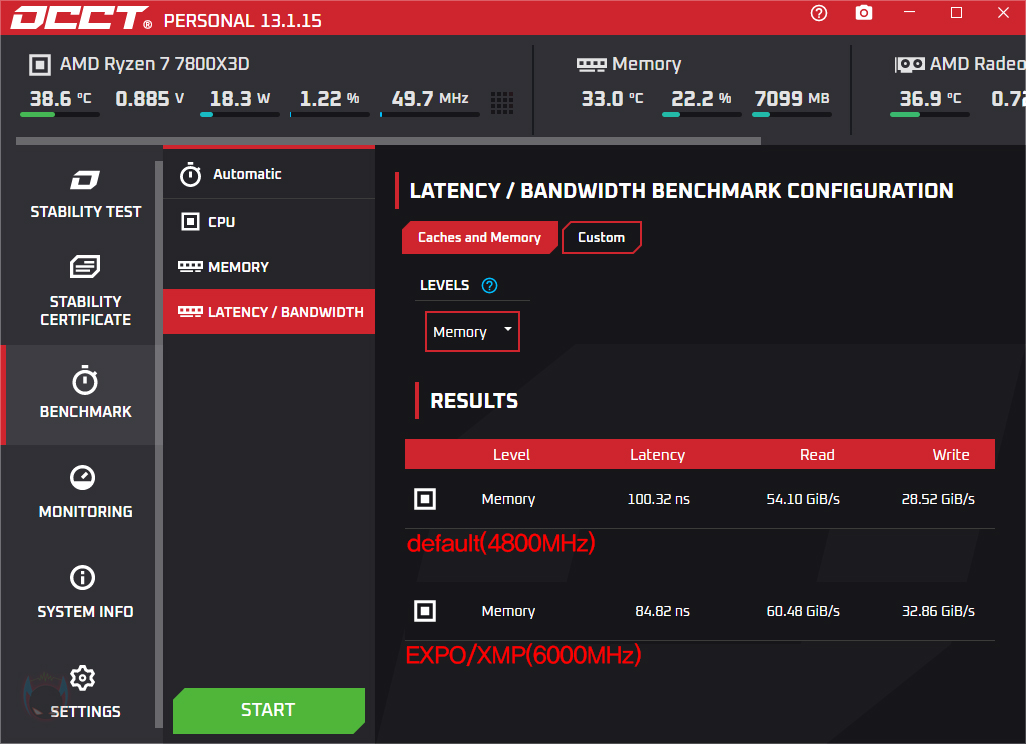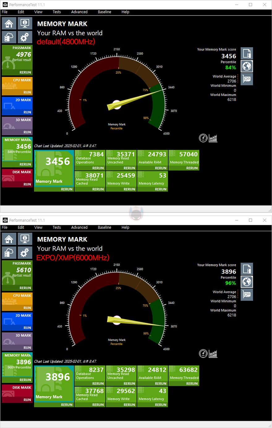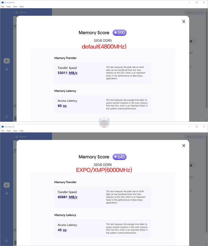 킹뱅크 DDR5-6000 CL28 메모리(RAM)에 적용된 XMP/EXPO 프로파일 설정값으로 기본 4800MHz 클럭 작동일 때와 성능 비교를 해보면, 클럭도 높아졌기 때문에 대역폭이 늘어난 효과도 있지만, 역시 가장 눈에 띄는 효과는 확연하게 낮아진 지연속도 즉 빨라진 레이턴시(Latency)입니다. AIDA64 Cache&Memory Benchmark, MaxxMem, RAM Test Pro-Memory Benchmark, OCCT-Latency, Novabench-Memory Test 프로그램에서 대역폭 증가와 함께 레이턴시가 확연하게 줄어든 것을 확인할 수 있죠. 물론, 점수로 측정하는 Passmark Performance Test-Memory Mark에서도 더 높은 점수로 성능이 향상된 것을 확인할 수 있습니다.