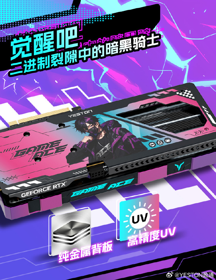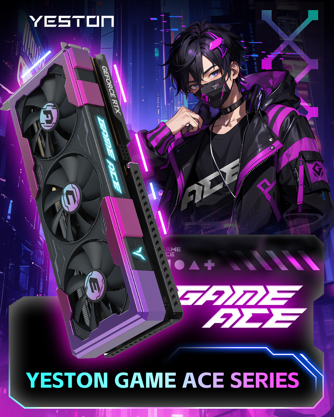 중국의 그래픽카드 전문업체 중 하나인 Yeston(예스톤)에서 사이버펑크(Cyberpunk) 감성의 새로운 디자인 그래픽카드 티저 이미지를 공개했다. 그동안 Yeston은 주력 그래픽카드에 여성 캐릭터 감성의 사쿠라(Sakura) 디자인을 적용했는데, 이번에 처음으로 남성 캐릭터 감성의 디자인을 적용했다. 이번에 공개된 그래픽카드는 Game Ace라는 타이틀과 함께 블랙과 퍼플(Black&Purple) 조합의 메탈릭 색상을 적용했으며, 후면에도 캐릭터 디자인이 적용된 메탈 백플레이트를 적용하고 있다.