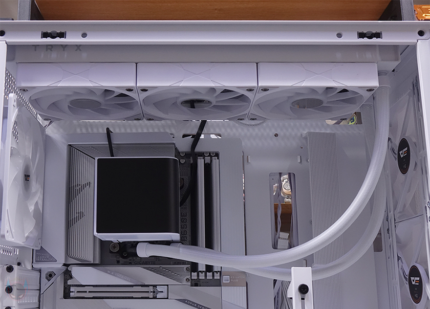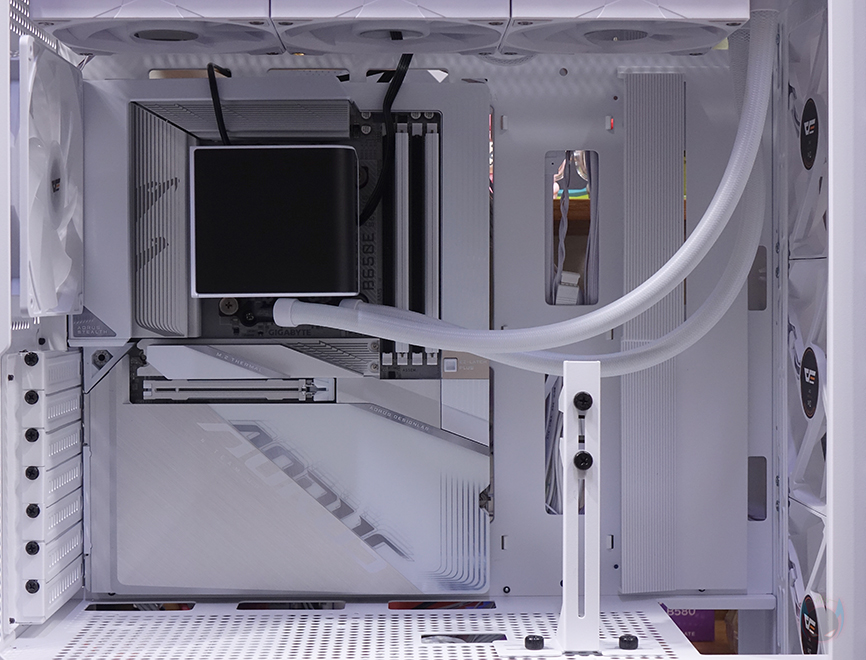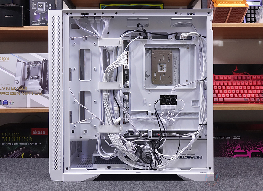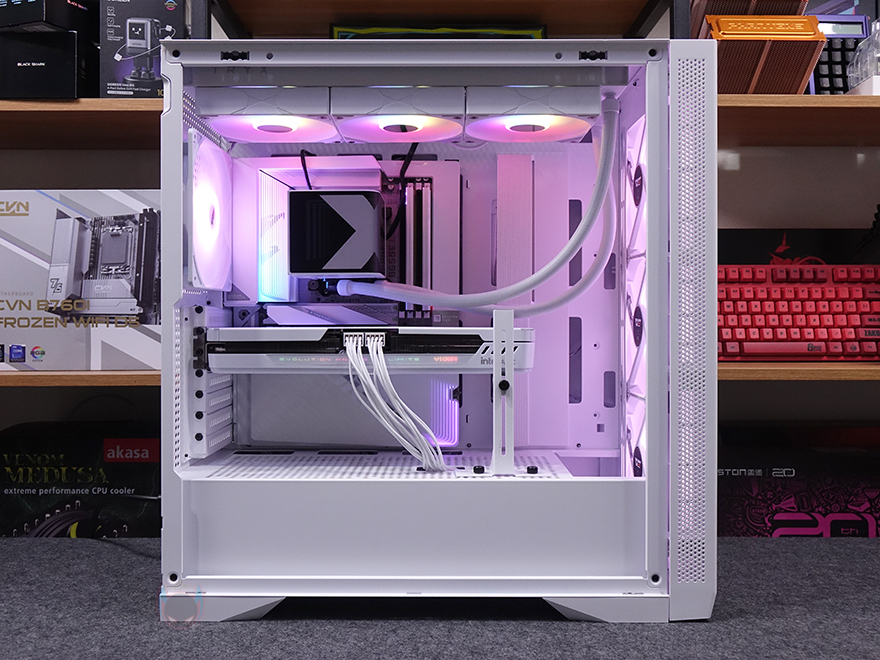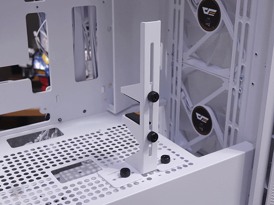 직접, 다크플래쉬 DF4100 PC케이스를 사용해 시스템 조립을 해보면, 앞서 언급했듯이 메인보드는 폼 규격으로는 E-ATX까지 장착이 가능하며, 파워서플라이 케이블과 연결되는 커넥터가 앞에 배치되는 기본형부터 백-커넥터 일명 BTF 메인보드까지 장착이 가능합니다. 실제 BTF 메인보드를 장착해 보면, 확실히 기본형 메인보드보다 내부가 깔끔한 효과를 볼 수 있고, 후면 커넥터도 케이스 홀처리에 완벽하게 배치되죠. CPU쿨러 같은 경우 공랭쿨러 타워형을 장착할 때는 최대 185mm까지 가능하기 때문에 사실상 시중에 판매되는 타워형 쿨러는 모두 장착이 가능하다고 보면 되고, 수랭쿨러시에는 전면에 기본 팬이 장착되어 있기 때문에, 기본 장착은 상단이며, 최대 360mm 라디에이터를 장착할 수 있습니다. 그래픽카드(VGA)는 최대 435mm 길이까지 가능하기 때문에 역시 시중에 판매되는 제품들은 대부분 장착이 가능하다고 보면 되고, 앞서 확인했듯이 PCI 슬롯 방향전환이 가능하기 때문에, 라이저케이블만 있으면 수직방향으로도 장착이 가능합니다. 물론, 라이저케이블 받침대 stand-off는 기본 제공해주고 있죠.