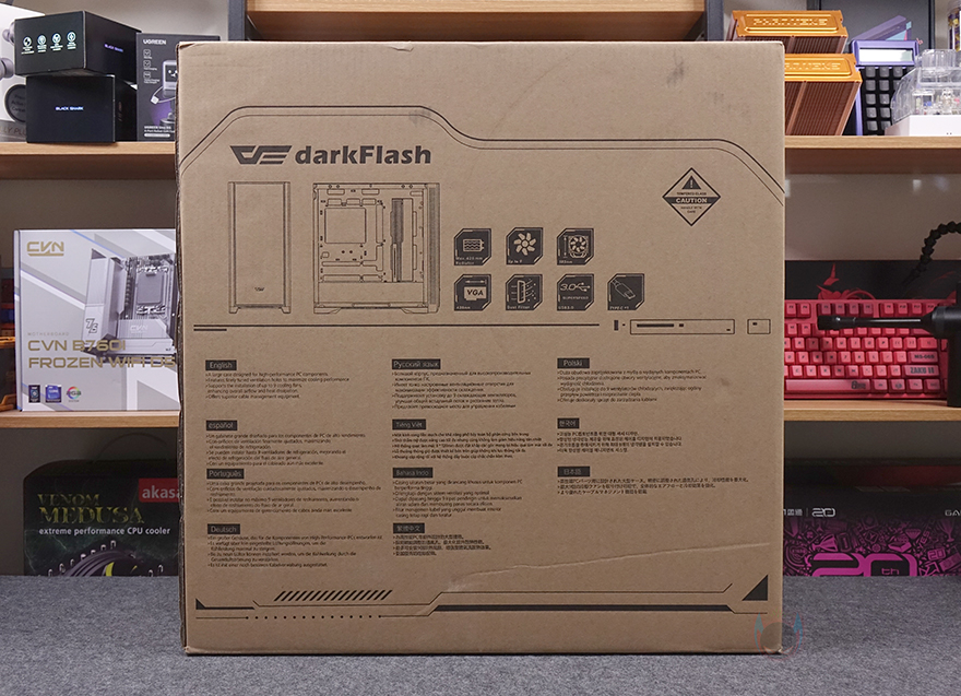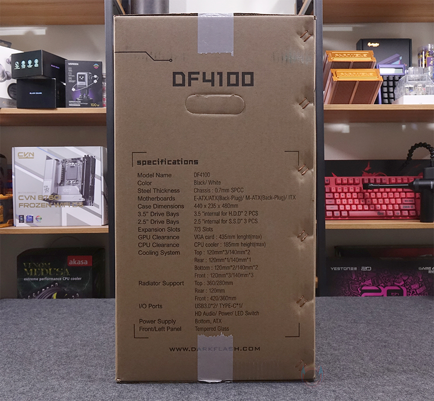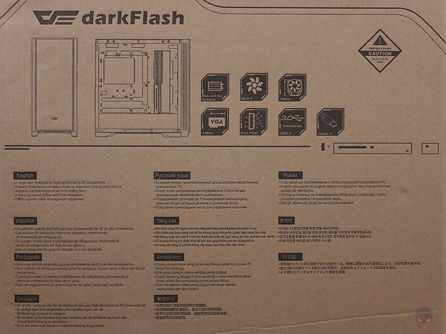 제품박스부터 살펴보면, 전면에는 DF4100 모델명과 함께 제품 풀샷 이미지를 담고 있습니다. 그리고, 반대쪽 후면에는 주요 특징과 특징부분은 한국어를 포함한 다국적 언어로 표기해 놨죠. 주요 특징에는 최대 420mm 라디에이터 장착 지원, 최대 9개의 쿨링팬 장착 지원, 최대 185mm 높이 공랭쿨러 장착 지원, 최대 435mm 길이 그래픽카드 장착 지원, 먼지 필터와 USB 포트 지원을 언급하고 있습니다. 물론, 박스 한쪽 측면에 제품의 기본 사양표기를 해놨기 때문에 좀 더 자세하게 확인할 수 있고, 오프라인 매장에 구입 시에도 충분히 도움이 되는 정보입니다.