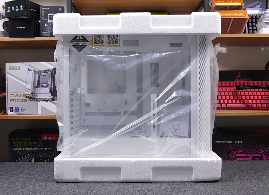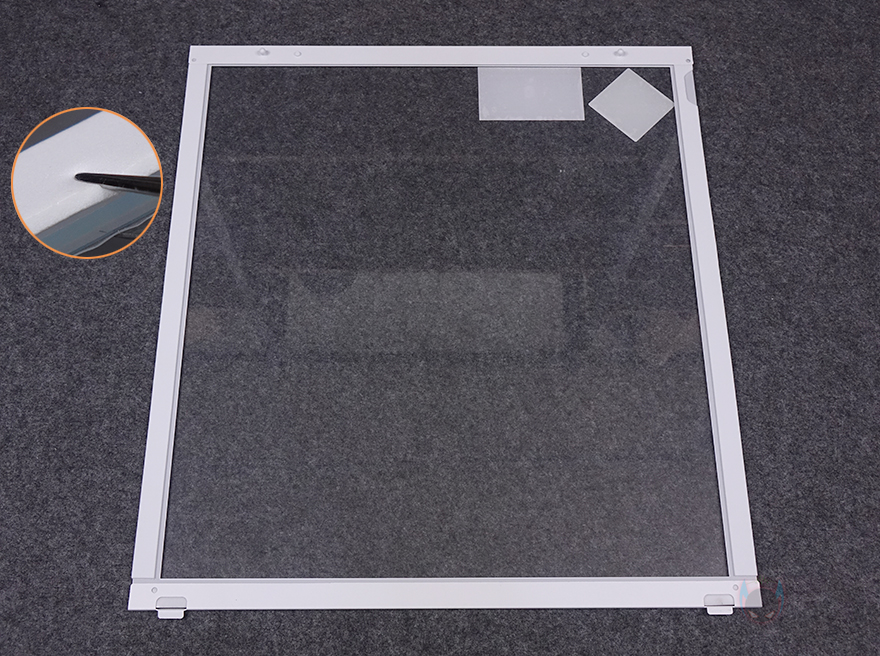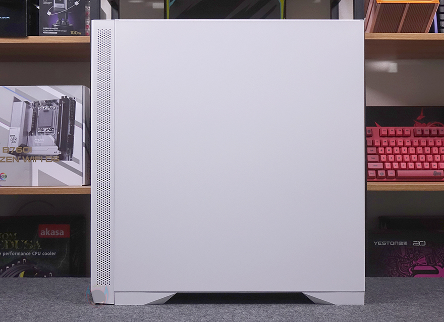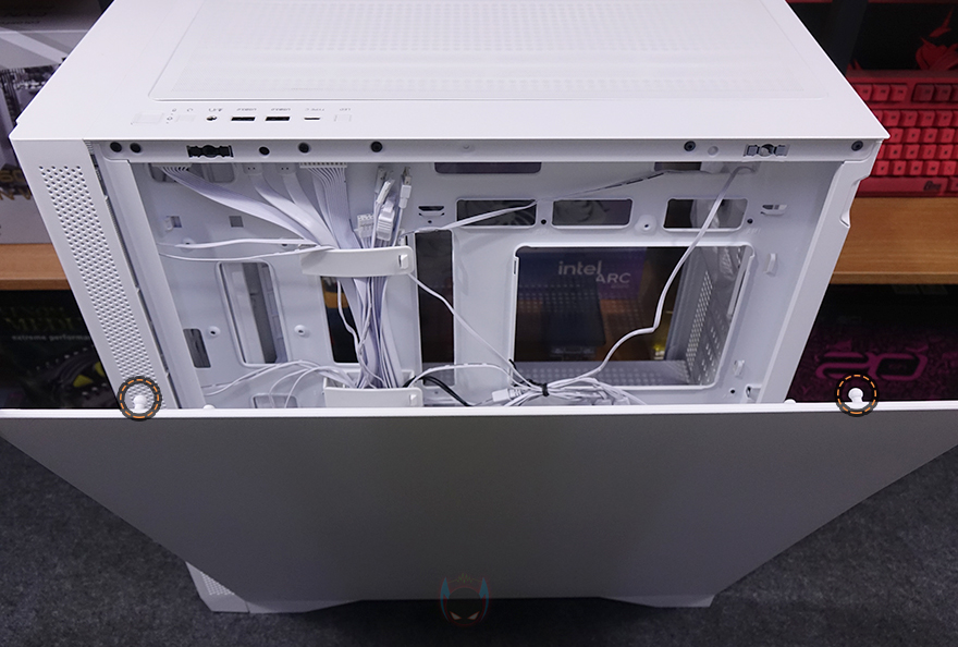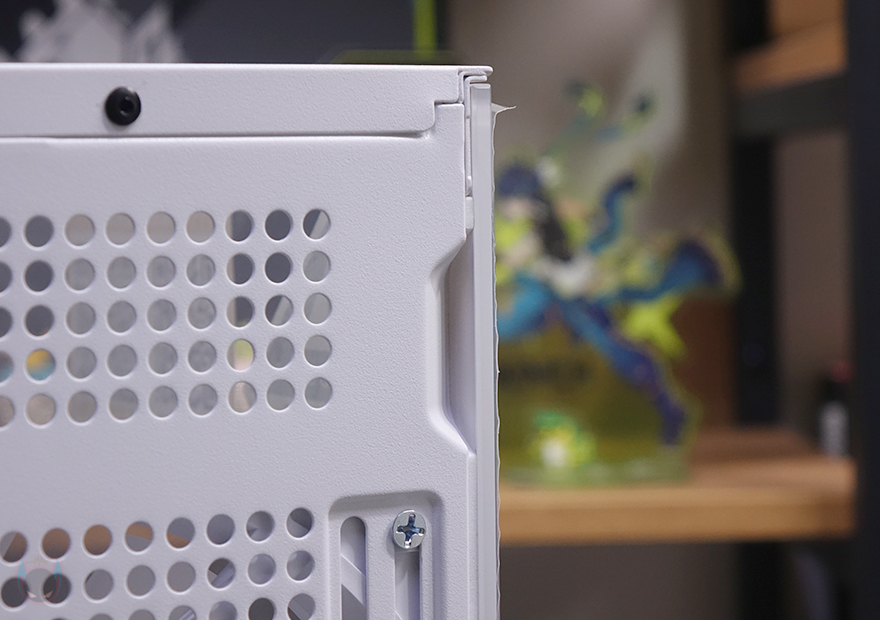 사이드 패널 같은경우에는 전면 기준 왼쪽 패널은 강화유리 패널로 후면 손잡이 홈을 통해 바로 분리할 수 있는 무나사 방식의 스냅핏 흔히 말하는 볼헤드핀 클램프 방식을 적용했습니다. 물론, 패널 아랫부분에는 걸쇠처리를 해놨으며, 유리 안쪽 테두리 위아래는 프레임을, 양쪽으로는 닫을 때 충격보호를 위해 패드를 부착해 놨죠. 참고로, 개봉 시 강화유리 보호비닐이 부착되어 있는데, 기포 없이 이 깔끔하게 부착되어 있기 때문에 바로 제거할지 사용하다가 제거할지 사용자가 판단하면 됩니다. 그리고, 반대편 오른쪽 패널은 새시 패널이면서 역시 무나사 방식의 볼헤드핀 클램프 방식을 적용하고 있죠. 그래서, 전면과 양쪽 패널 모두 별도의 공구 없이 바로 분리할 수 있는 편리함이 있습니다.