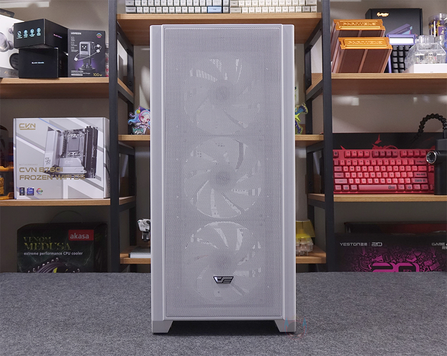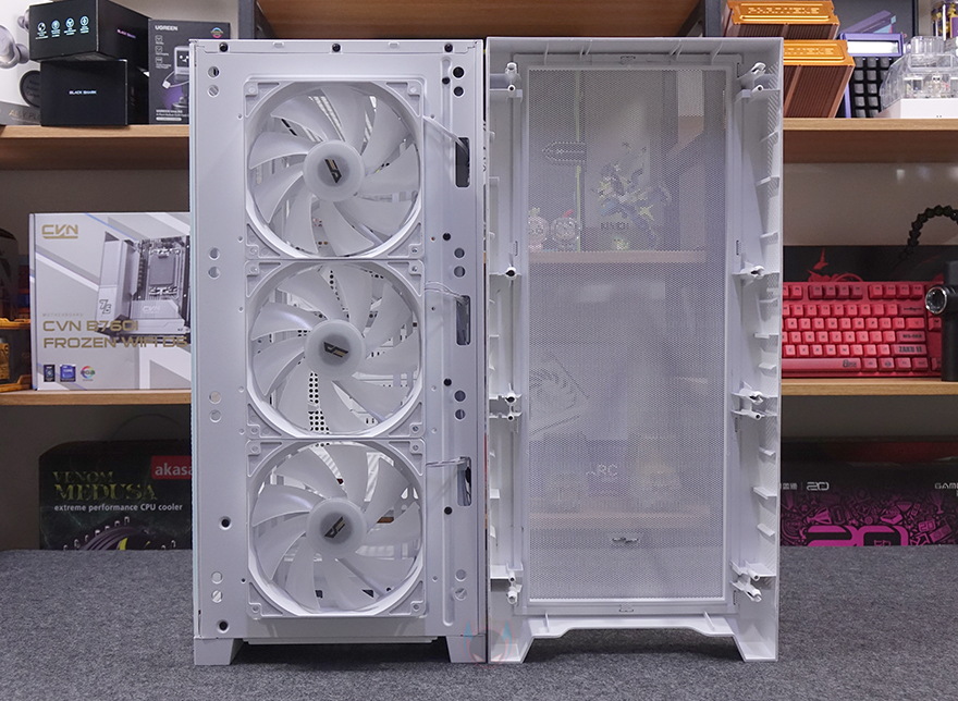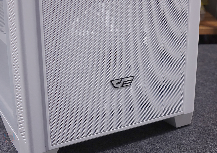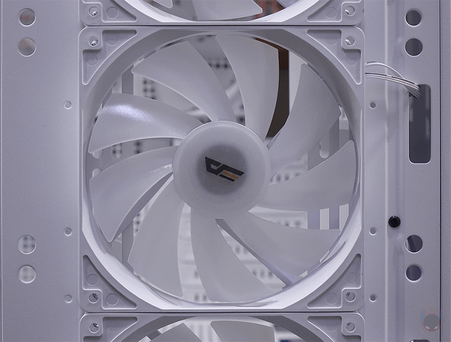 그럼, 다크플래쉬의 DF4100 PC케이스 외형부터 살펴보는데, 일단 색상은 블랙과 화이트 2가지로 출시되었으며, 시작에서 언급했듯이 쿨링이 강조되는 디자인이 전면 메쉬 디자인을 확인할 수 있습니다. 그리고, 아래 중간쯤에는 다크플래쉬 로고를 적용해 놨으며, 밝은 곳에서 보면 메쉬 뒤쪽 그러니깐 내부에 팬이 기본 장착된 걸 미리 엿볼 수 있는데, 전면 베젤 분리가 가능하기 때문에 분리하면 총 3개의 팬이 기본 장착된 걸 확인할 수 있습니다. 팬은 모두 140mm 크기이며, 9개의 날개를 가졌고, 팬 위치마다 오른쪽에 케이블을 통과할 수 있게 홀처리도 해놨고, 팬을 분리하면 140mm 외에 120mm 팬도 교체장착할 수 있게 나사홀이 처리된 걸 확인할 수 있습니다. 물론, 수랭쿨러시 라디에이터를 전면에 장착하고 싶다면 기본 팬을 분리하고 장착할 수 있으며, 일부 제품에 따라선 최대 420mm 라디에이터까지 가능합니다.