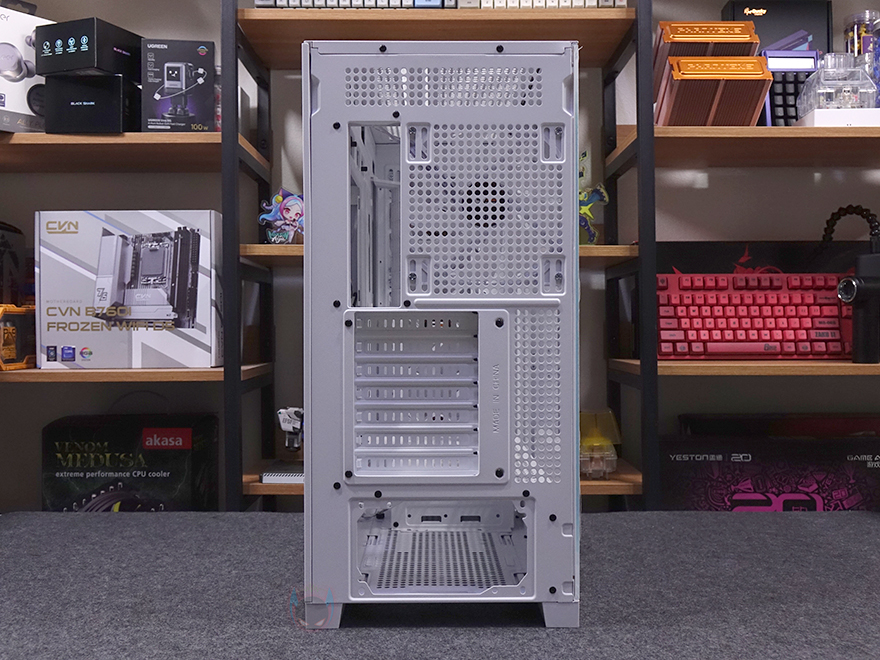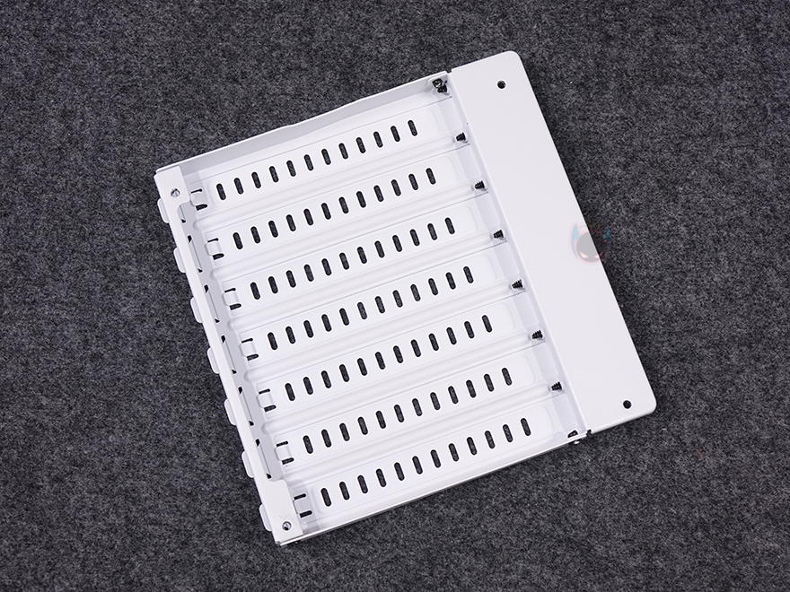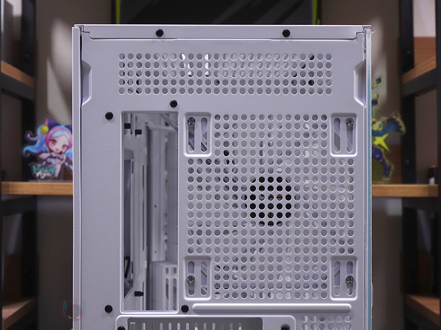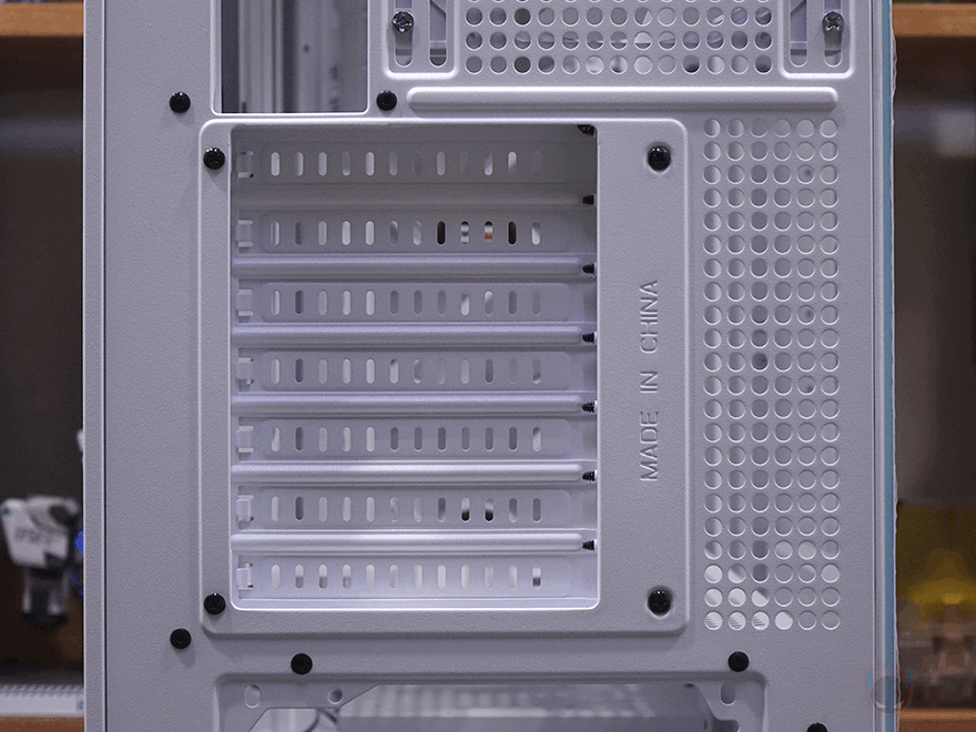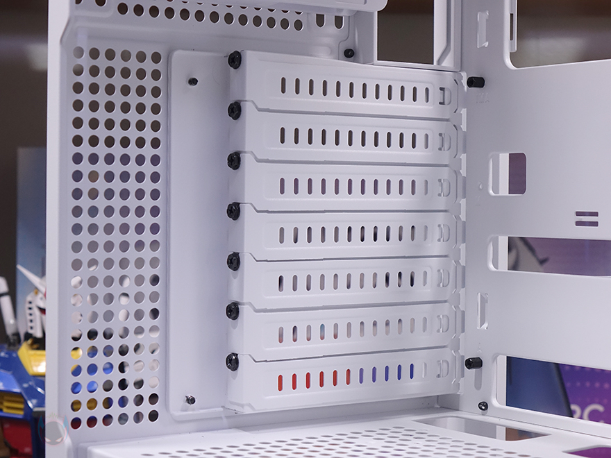 케이스 후면에는 후면 배기 역할로 에어홀 처리와 함께 내부에 140mm 팬이 기본 장착된 것을 미리 간접적으로 확인할 수 있는데, 나사홀이 120mm도 있어서 120mm 교체 장착도 가능합니다. 또한, 바로 위 그러니깐 내부 상단부분의 후면에도 에어홀 처리를 해놨는데, 높이가 꽤 있어서 상단 공간 확보를 충분히 하고 있다는 것도 짐작할 수 있죠. PCI슬롯은 미들타워 기준인 7개를 갖추고 있으며, 슬랫 주변에 고정 나사를 풀면, 분리해서 90도 방향전환을 할 수 있습니다. 즉, 그래픽카드를 수직방향으로 장착할 수 있게 해 주죠. 물론, 별도의 라이저케이블(https://darkflash.co.kr/product/detail2.html?product_no=698)을 구매해서 사용해야합니다. 그리고, 맨 아래에는 파워서플라이 자리로 상하방향 모두 장착할 수 있게 나사홀이 처리되어 있죠.