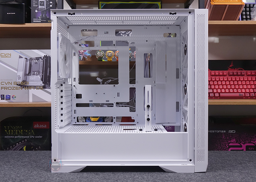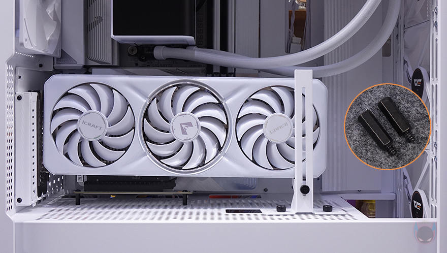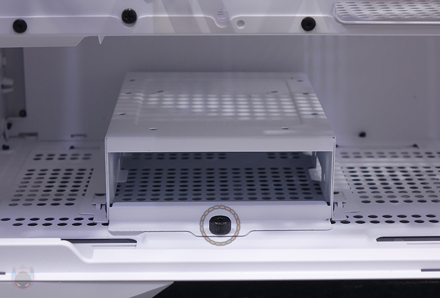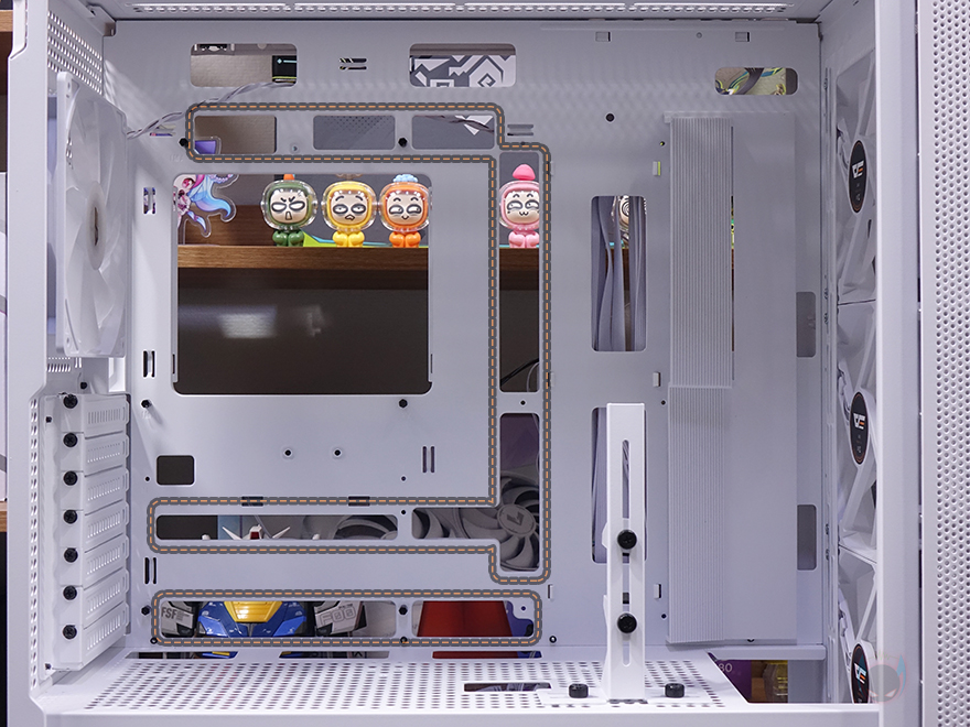 또한, 내부 하단과 공간 분리를 해주는 파워서플라이(PSU) 커버도 적용되어 있는데, 커버 상단에는 그래픽카드(VGA) 지지대도 기본 장착되어 제공해주고 있습니다. 모두 손나사 방식으로 지지대 위치조절은 물론, 지지대 받침대 위치조절까지 가능하죠. 또한, 커버부분에도 전체적으로 에어홀 처리와 선정리 홀이 주요 위치마다 배치되어 있으며, 그래픽카드 지지대를 사용하지 않는다면, 분리해서 커버 상단에 추가로 140mm 또는 120mm 팬을 최대 2개 장착해 추가 쿨링시스템을 갖출 수도 있습니다. 그리고, 내부 후면에는 앞서 외부에서 언급했던 배기 역할의 140mm 팬을 다시 확인할 수 있는데, 전면과 동일한 모델(C7A)이며, 기본 제공되는 팬 모두 ARGB 팬에 3 Pin 연결방식으로 팬속도는 950(±10%) RPM입니다. 그리고, 아래 PCI 슬롯 가이드는 모두 재사용이 가능한 착탈식이죠.