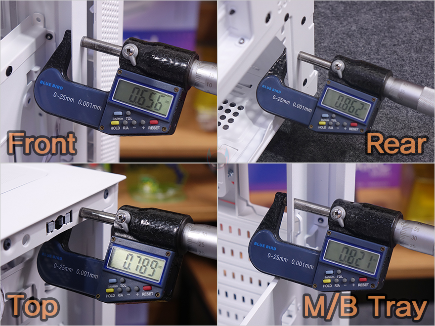 메인보드 트레이 후면을 살펴보면, CPU 컷-아웃 홀 바로 아래에는 ARGB 허브가 장착되어 기본 제공되는데, ARGB 헤더만 장착할수 있고, 최대 6개까지 연결이 가능합니다. 물론, 메인보드와 연결할 수 있는 5V ARGB 케이블도 있으며, 사용하는 메인보드에 5V ARGB 헤더가 없는 경우 바로 파워서플라이와 연결해 사용할 수 있게 SATA 전원케이블도 갖추고 있죠. 조금 아쉬운 점이라면 팬까지 연결할 수 있는 허브였으면 더 낫지 않았을까 생각됩니다. 그리고, 왼쪽에는 선정리홀 위치에 맞춰서 케이블을 묶어둘 수 있는 클램프형 클립이 적용되어 있으며, 바로 옆 그러니깐 선정리 커버 패널과 같은 위치에 후면에는 2.5인치 HDD/SSD를 최대 2개까지 장착할 수 있게 나사홀을 처리해 놨습니다. 또한, 내부 하단 앞자리에는 외부에서 언급했던 HDD 베이가 장착되어 있는데, 손나사를 풀면 분리가 가능하고, HDD 베이에는 안쪽에 기본 3.5인치 HDD 1개와 상단에 3.5인치 HDD 또는 2.5인치 HDD/SSD를 추가로 1개 더 장착할 수 있게 지원하고 있습니다. 그리고, 하단 후면 파워서플라이 자리에는 진동소음 최소화를 위해 패드를 기본 부착해 놨으며, 케이스에 버튼 및 포트 케이블들도 색상에 맞춰서 화이트 케이블을 사용했습니다. 끝으로, DF4100 PC케이스에 사용된 새시의 두께를 측정할 수 있는 위치별로 측정해 본 결과 0.6~0.8mm 대인 것을 확인할 수 있습니다.