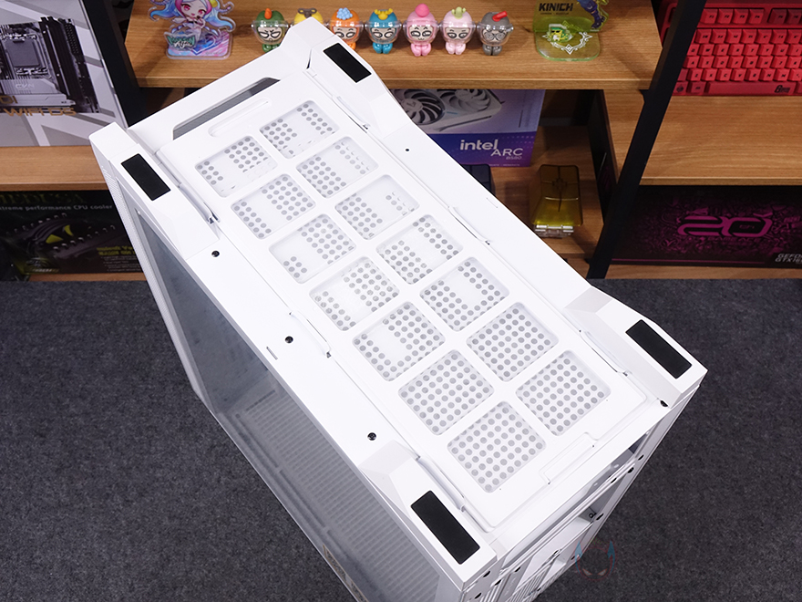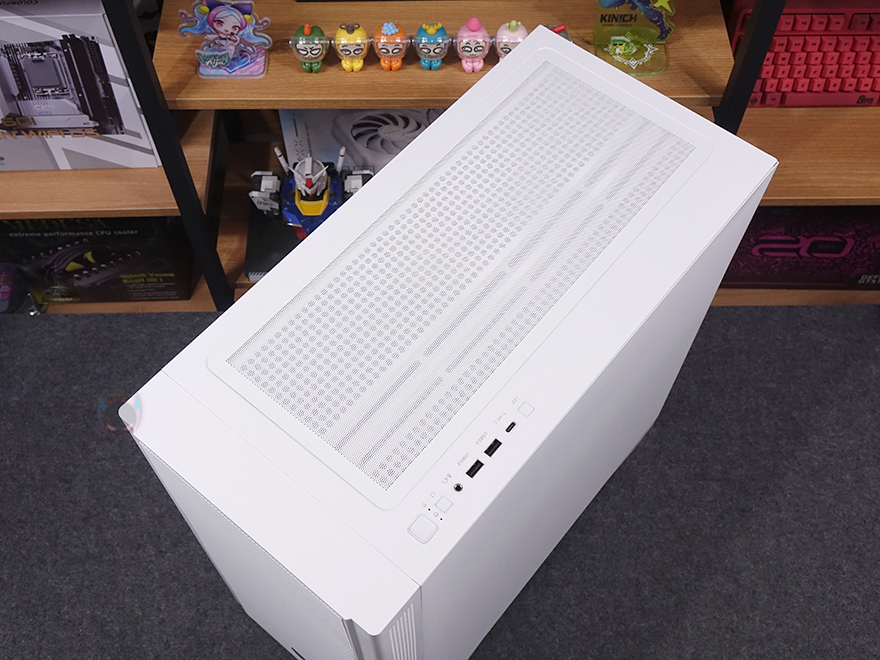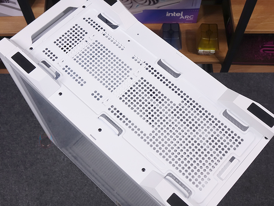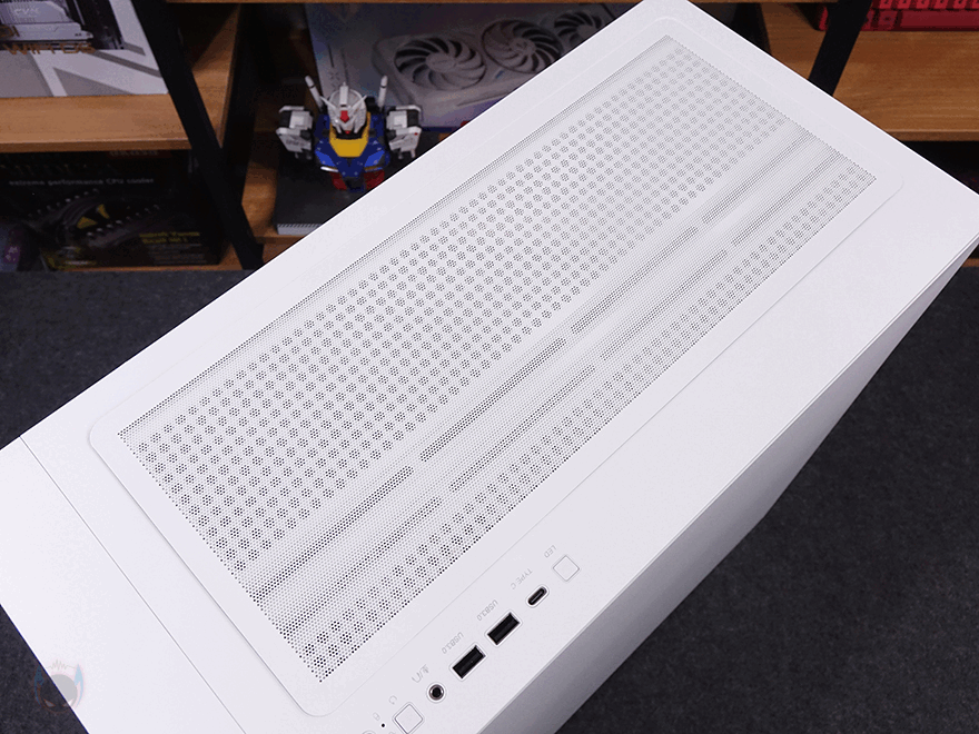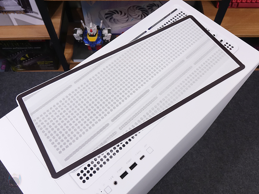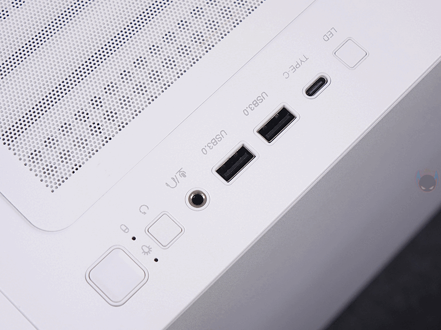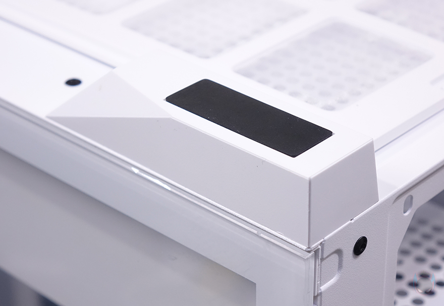 케이스 상단에는 자석방식의 먼지필터가 장착되어 있으며, 필터를 분리하면 내부 상단에 쿨링시스템을 추가로 갖출 수 있게 에어홀 처리와 함께 양쪽으로 나사홀 처리가 되어 있습니다. 팬 장착시에는 140mm 최대 2개 또는 120mm 최대 3개를 장착할 수 있으며, 수랭쿨러시 라디에이터는 최대 360mm까지 장착할 수 있습니다. 그리고, 상단 맨 오른쪽 앞부분에는 버튼 및 포트가 나열되어 있는데, 맨 앞에 전원버튼을 시작으로 뒤로 리셋 버튼, 오디오/마이크 포트, USB 3.0 타입 A포트 2개, USB 타입 C포트 1개, LED 모드 버튼순으로 배치되어 있습니다.