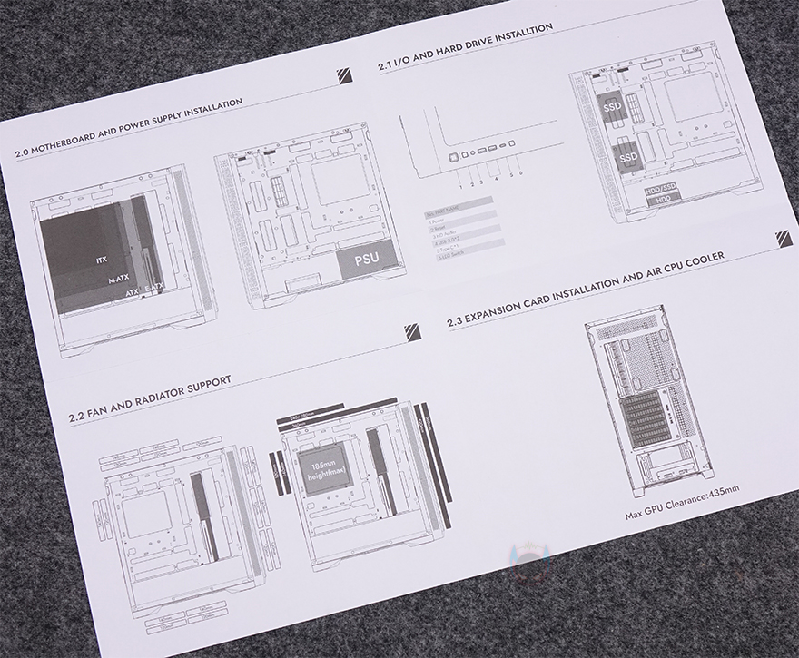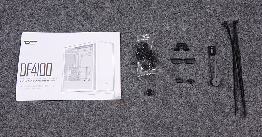 제품 포장은 케이스 기본 비닐포장과 함께 외부 충격보호를 위한 스티로폼 포장재를 사용했으며, DF4100 PC케이스를 제외한 나머지 구성품에는 제품 설명서, 부품장착에 사용되는 나사들, stand-off 렌치, 여분의 볼헤드핀 클램프, USB 포트 마개, 비프음 스피커, 소량의 케이블타이를 제공해주고 있습니다. 기본 케이스 구조형태이기때문에 제품 설명서 내용은 비교적 간단합니다.