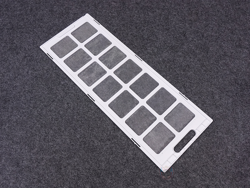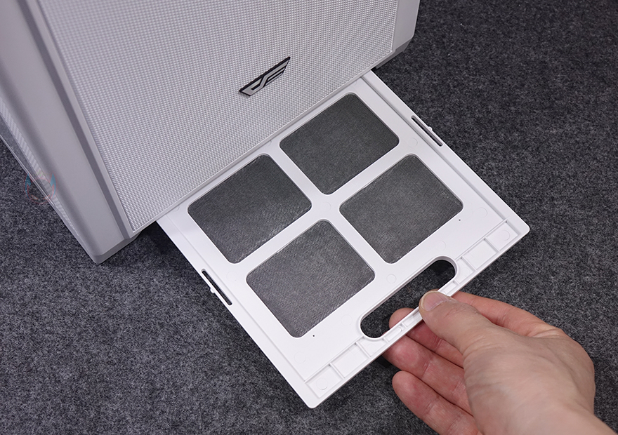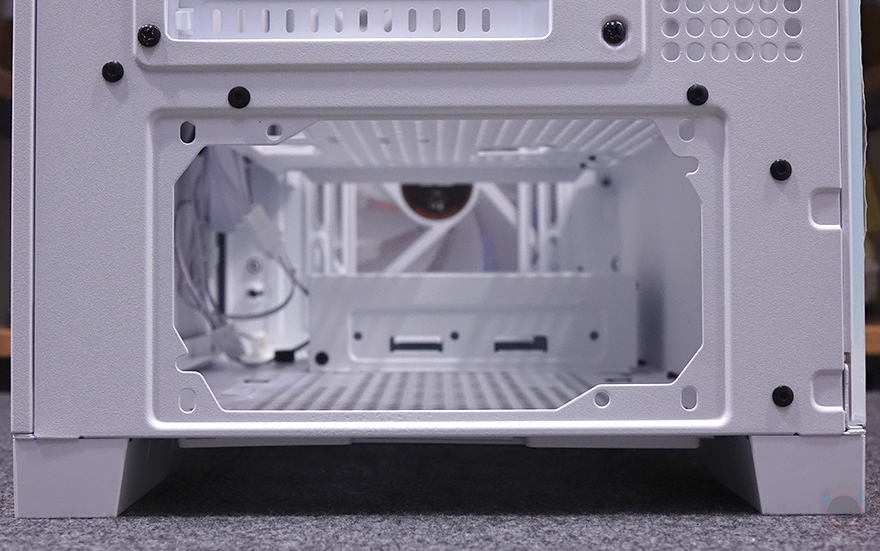 케이스 밑바닥부분에는 받침대를 제외한 전체 영역으로 분리형 먼지 필터가 장착되어 있는데, 전면에서 분리할 수 있어서 청소 시 편하며, 필터를 분리하면 하단 쿨링효과를 위해 전체적으로 에어홀 처리를 해놨습니다. 또한, 내부에서 확인하겠지만, 내부 하단 앞자리에 HDD베이를 분리할 수 있게 걸쇠방식으로 적용된 것도 확인할 수 있죠. 받침대는 약 22mm 높이를 가졌으며, 패드도 기본 부착되어 있습니다.