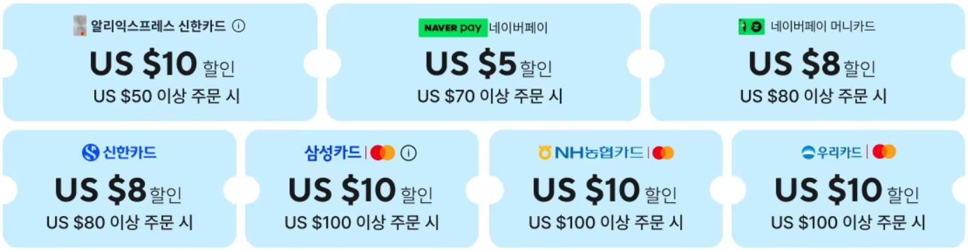 이번 5월 프로모션 '얼리썸머세일' 역시 할인코드와 결제할인 혜택이 주어지는데, 할인코드는 7가지 가격대별로 제공되며, 결제할인은 페이는 네이버 페이, 카드는 알리익스프레스 신한카드, 네이버페이 머니카드, 신한/삼성/NH농협/우리카드로 혜택받을 수 있다. 특히, 최근 새롭게 출시한 알리익스프레스 전용 신한카드 혜택이 이번에 크다. 50달러이상 주문시 10달러 할인이다. 물론, 다른 결제할인도 충분히 매리트가 있기때문에 소비자가 구입하고자하는 금액대에 맞춰서 할인코드와 결제할인 모두 적용했을때 가장 큰 혜택을 받아볼 수 있다. 결제할인은 페이와 카드사별로 한 번씩 사용할 수 있고, 할인코드는 입력코드명 기준으로 한 번씩 사용할 수 있으며, 할인코드 정보는 아래를 참고하면 되겠다.