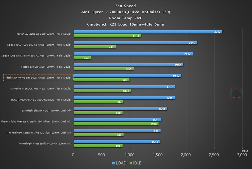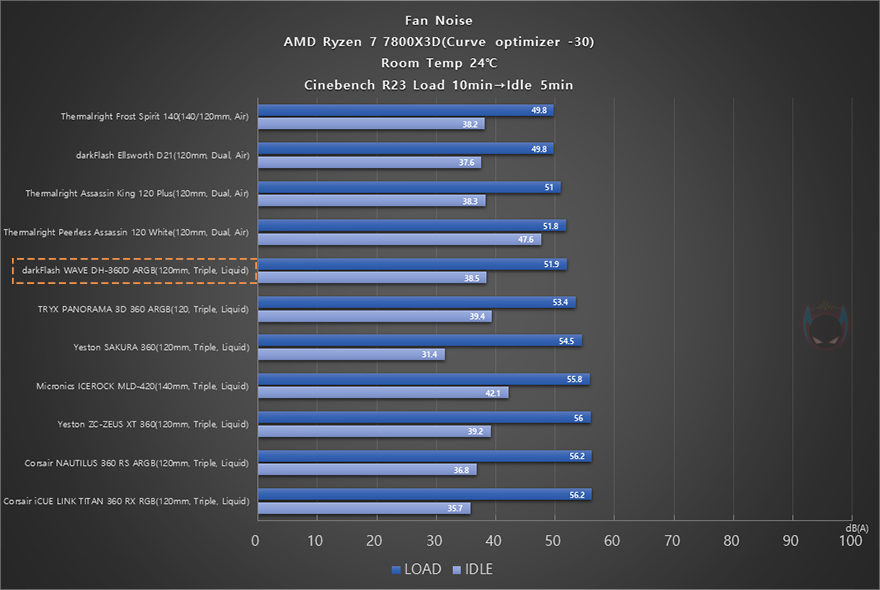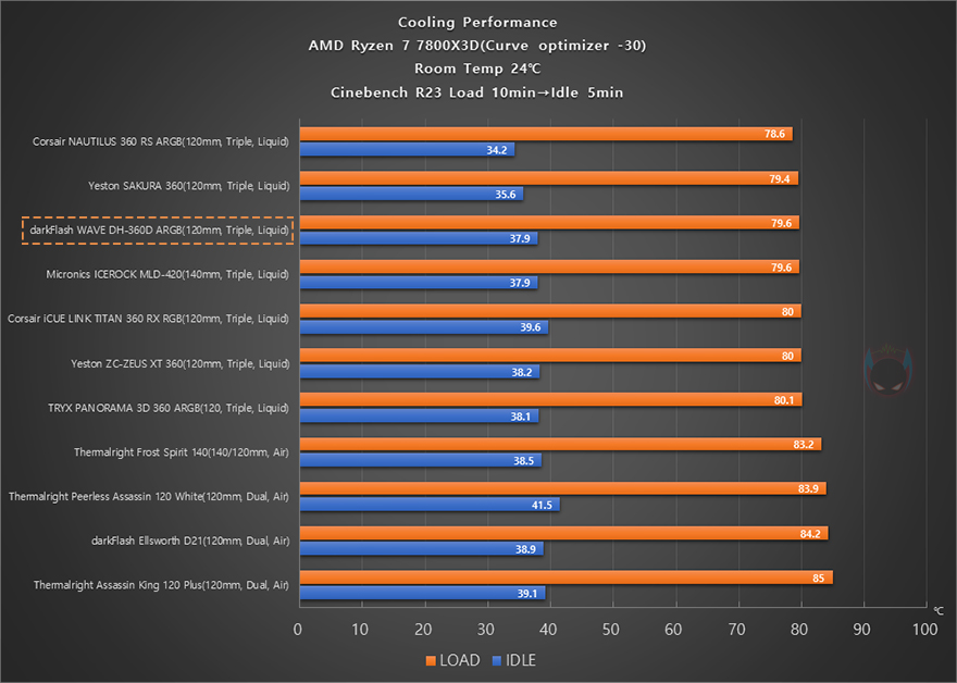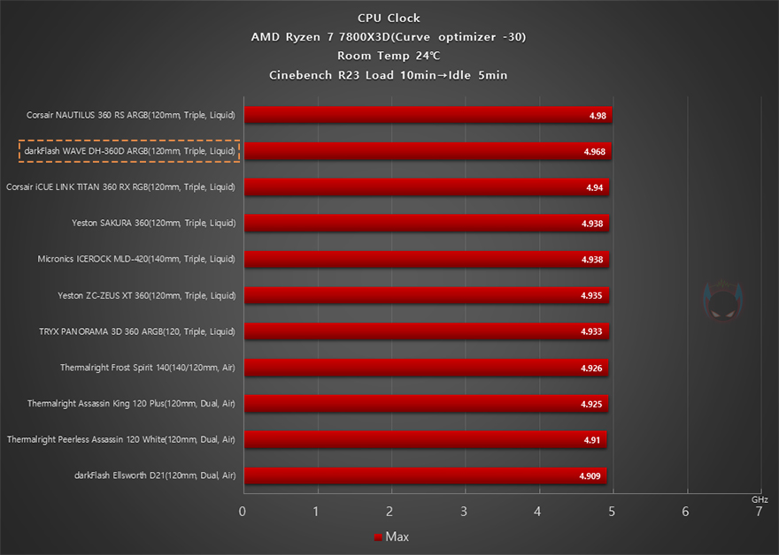 끝으로, 이제 WAVE DH-360D 일체형 수랭쿨러의 쿨링 성능을 확인해 보는데, 사용된 CPU는 AMD 라이젠 7 7800X3D CPU이며, 최근 CPU들은 부스트클럭도 높게 적용되어서 작동되기때문에, 예전에 비해 소비자가 직접 설정하는 수동 오버클럭의 매리트가 없습니다. 사용된 AMD 라이젠7 7800X3D CPU 같은 경우에도 인기가 많은 CPU지만, 수동 오버클럭보다는 커브옵티마이저(-30) 설정으로 더 많이 사용하기 때문에, 커브옵티마이저 설정에서 씨네벤치 R23 프로그램을 10분간 과부하 Load 후, 5분간 Idle로 돌아가는 상황으로 온도, 소음, 최대 클럭 작동을 확인해 봤습니다.