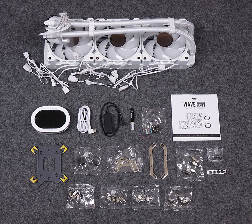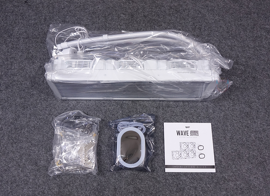 패키징 밴드를 벗겨서, 박스를 열어보면 충격보호를 위한 우레판 포장재와 함께 내부에 비닐 포장된 구성품들을 확인할 수 있습니다. 제품 설명서를 제외한 나머지 구성품들 각개 비닐 포장으로 처리되어 있으며, 전체 제품 구성에는 WAVE DH-360D 일체형 수랭쿨러, 모듈식 스크린 디스플레이, USB Type-C to USB 2.0 내장 커넥터 케이블, 팬 허브, 써멀 컴파운드, 제품 설명서가 제공되며, 나머지 부속품들은 인텔(Intel)용과 AMD용으롤 구분되어 각개 포장으로 제공됩니다. 부속품들은 뒤에 장착 시 한 번 더 언급하겠습니다.