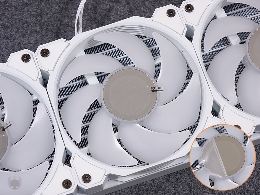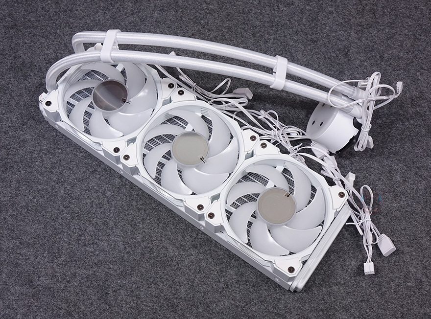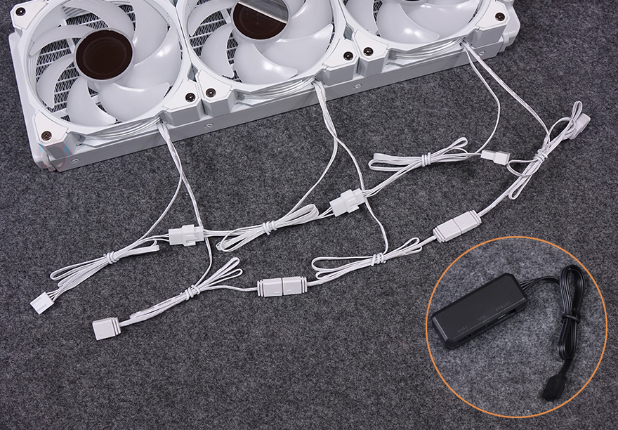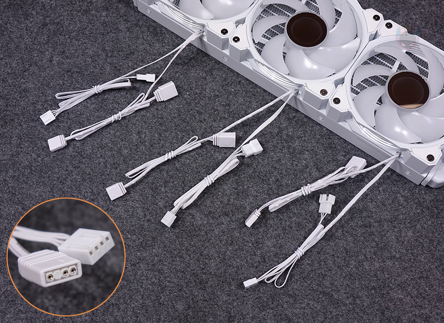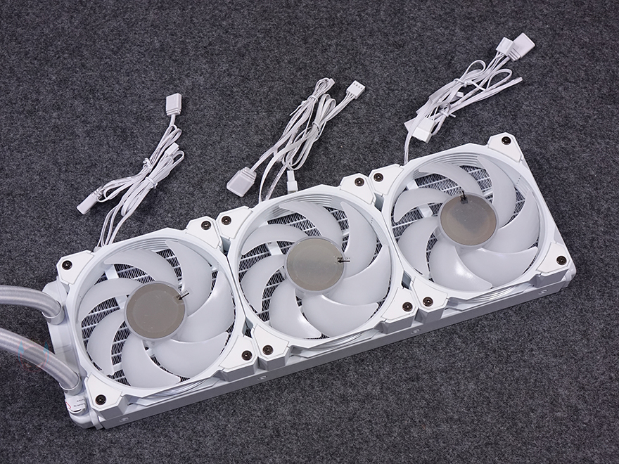 그럼, 다크플래쉬 WAVE DH-360D 일체형 수랭쿨러를 살펴보면, 먼저 색상은 블랙과 화이트 2가지로 출시되었으며, 앞서 제품박스에서 언급했듯이 국내 시장에는 360mm 라디에이터 모델만 출시한 상황입니다. 다른 일체형 수랭쿨러 제품들과 마찬가지로 개봉 시 라디에이터에는 기본 120mm 팬 3개가 장착되어 있으며, 7개의 날개를 가졌고, RGB 팬으로 가운데 베어링 부분 외형 디자인에는 인피니티 효과를 볼 수 있게 적용해 놨는데, 사용 전에 보호비닐을 제거해야 합니다. 또한, 측면 프레임 부분에도 RGB 효과를 볼 수 있게 적용되어 있고, 각 팬에는 작동 연결의 4핀 PWM 커넥터와 5V RGB 케이블이 적용되어 있으며, 서로 연결할 수 있게 Y자 연장케이블도 적용되어 있습니다.