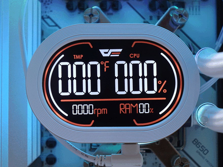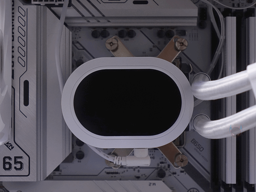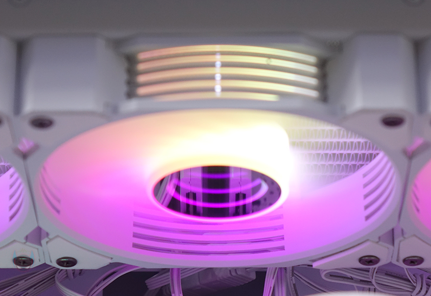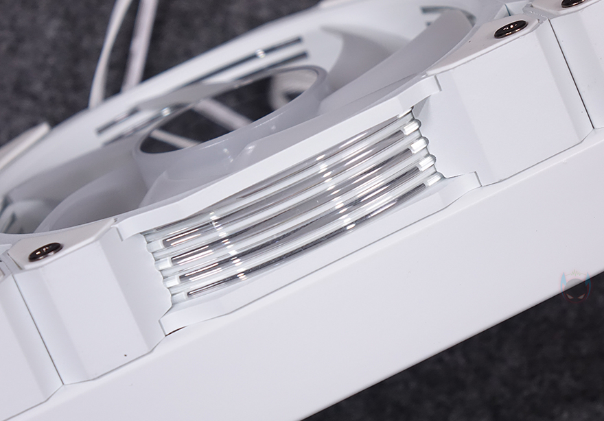 장착을 마무리한 후, PC 전원을 켜면 라디에이터에 장착된 팬과 워터블록에서 RGB 효과를 확인할 수 있는데, 팬 같은 경우 앞서 언급했듯이 중앙 베어링부분에는 인피니티 효과를 팬 테두리 프레임에서는 RGB 효과를 볼 수 있죠. 그리고, 모듈식 스크린 디스플레이 같은경우에도 분리했을 때, 워터블록에 RGB 효과를 볼 수 있는데, 모듈식 스크린 디스플레이를 장착하면, 측면에서 마치 링 디자인의 RGB 효과처럼 보입니다.