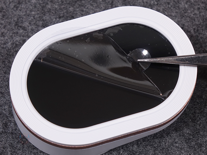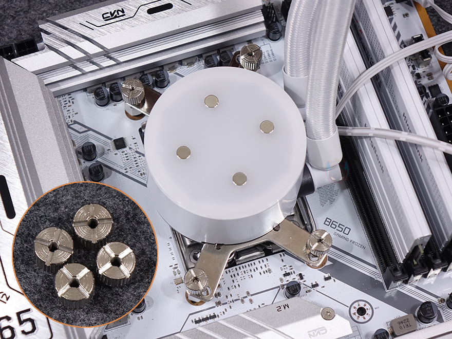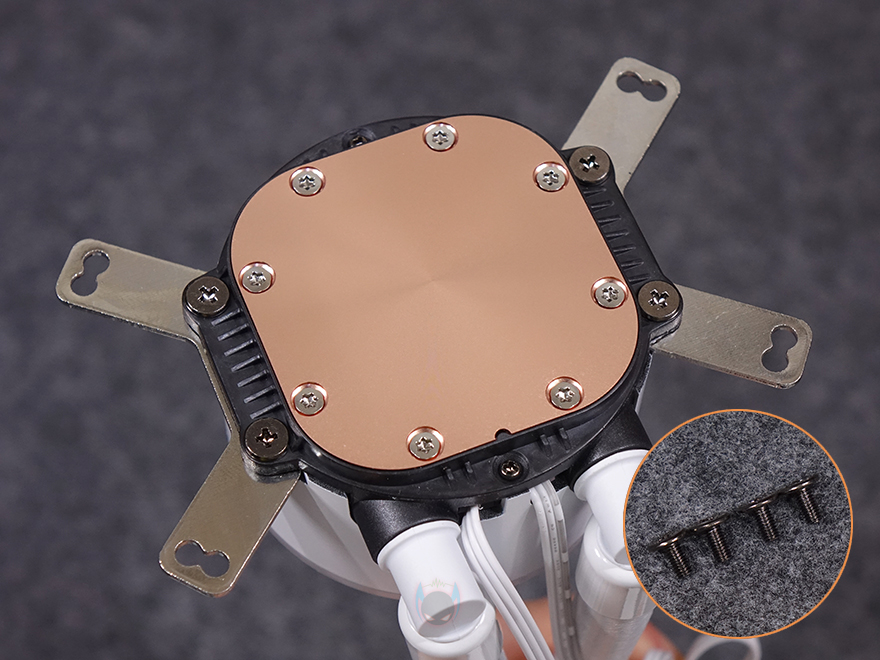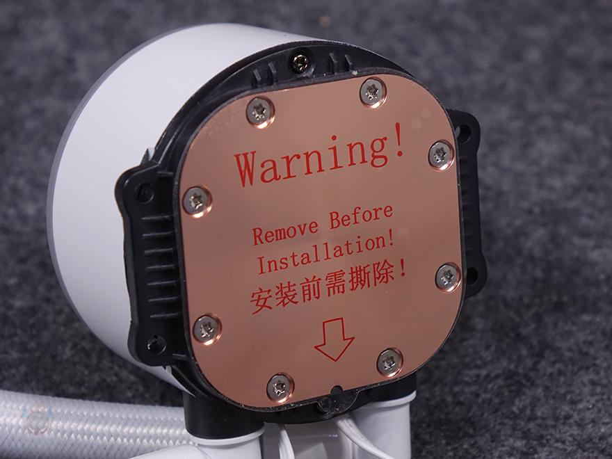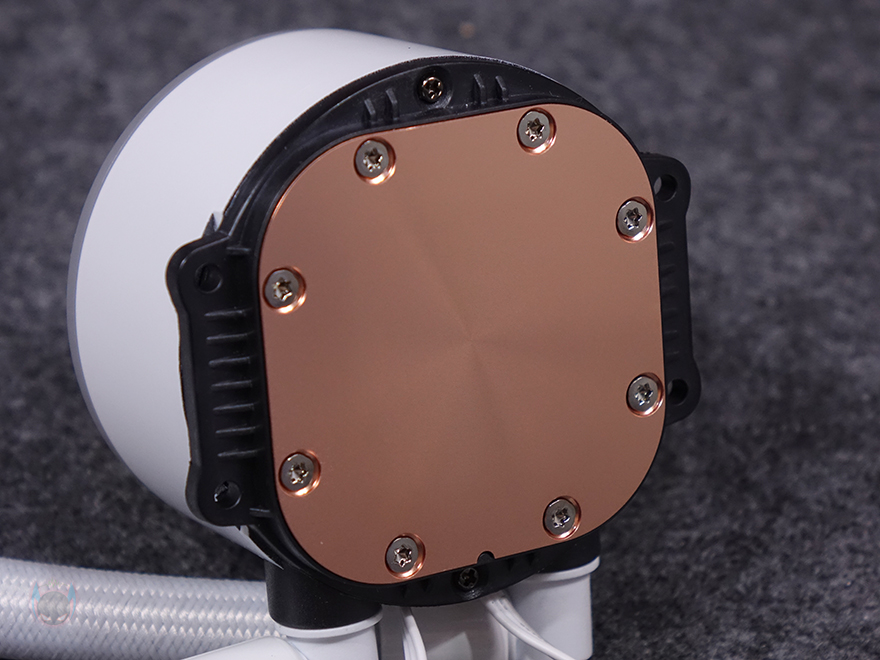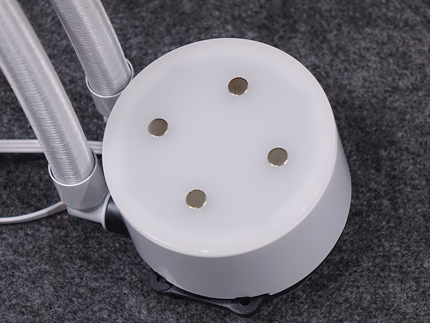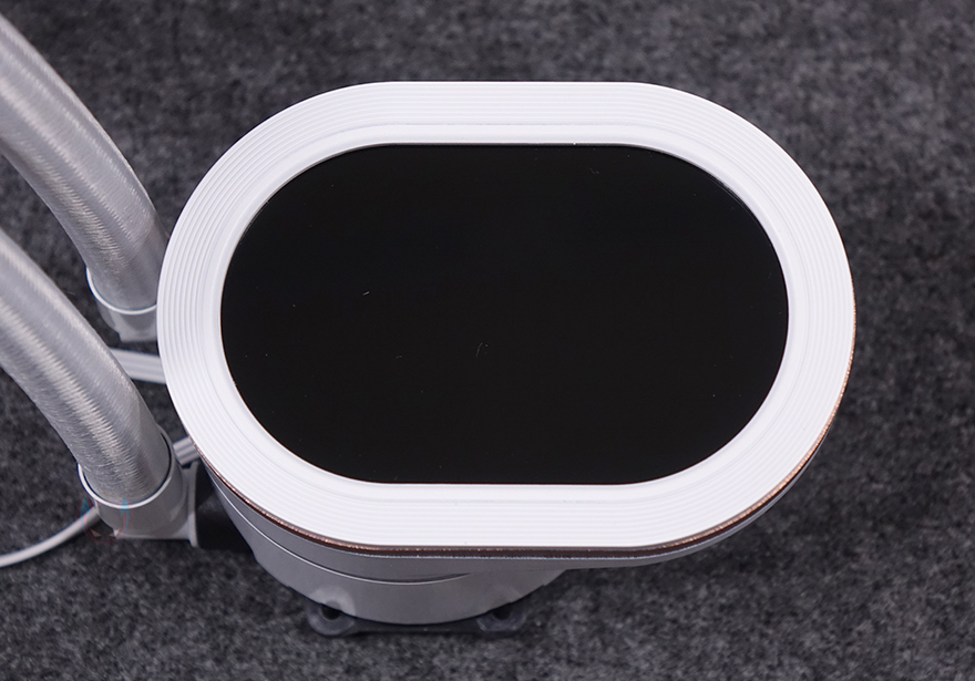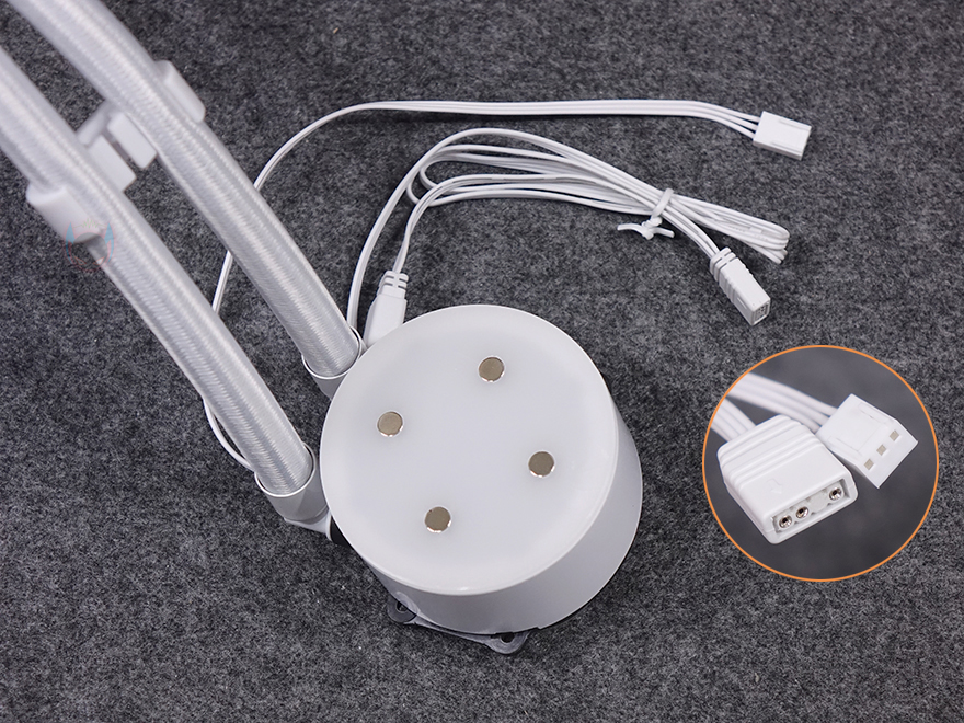 워터블록은 앞서 구성품에서 확인한 모듈식 스크린 디스플레이와 자석방식으로 장착되기 때문에 상단에 4개의 자석이 배치된 것을 확인할 수 있으며, 펌프 작동 연결방식은 3 핀이고, 워터블록에도 RGB 효과를 볼 수 있게 5V RGB 케이블을 적용하고 있습니다. 참고로, 라디에이터의 RGB 팬과 연장 연결해서 하나로 메인보드에 연결해 연동할 수 있습니다. 워터블록에 장착되는 모듈식 스크린 디스플레이는 타원형의 와이드 스크린으로 개봉 시 보호비닐이 부착되어 있고, 사용전에 제거를 해야합니다. 그리고, 한쪽 측면에 전원 및 작동 케이블과 연결되는 USB 타입 C포트가 배치되어 있으며, 케이블은 앞서 구성품에서 확인한 USB Type-C to USB 2.0 내장 커넥터로 메인보드 USB 2.0 내장헤더에 연결하면 됩니다. 끝으로, CPU와 맞닿는 베이스부분은 구리재질로 개봉시 역시 보호비닐이 부착되어 있기 때문에 제거를 해야 하며, 제거하면 매끄럽게 래핑처리된 상태를 확인할 수 있습니다.