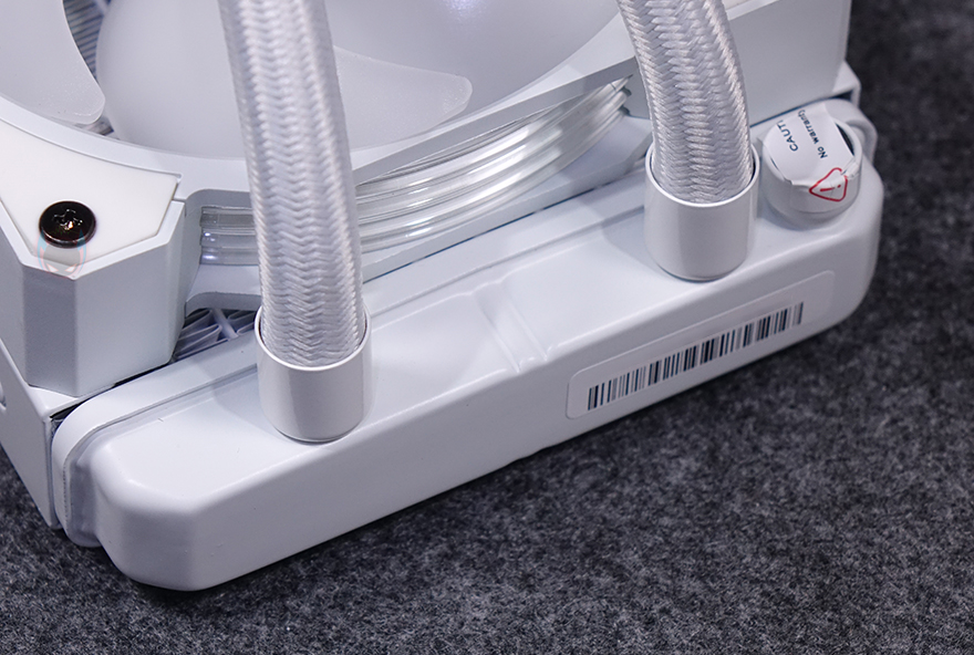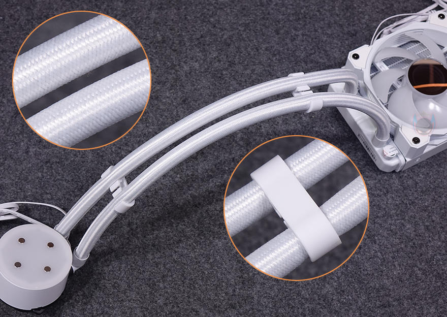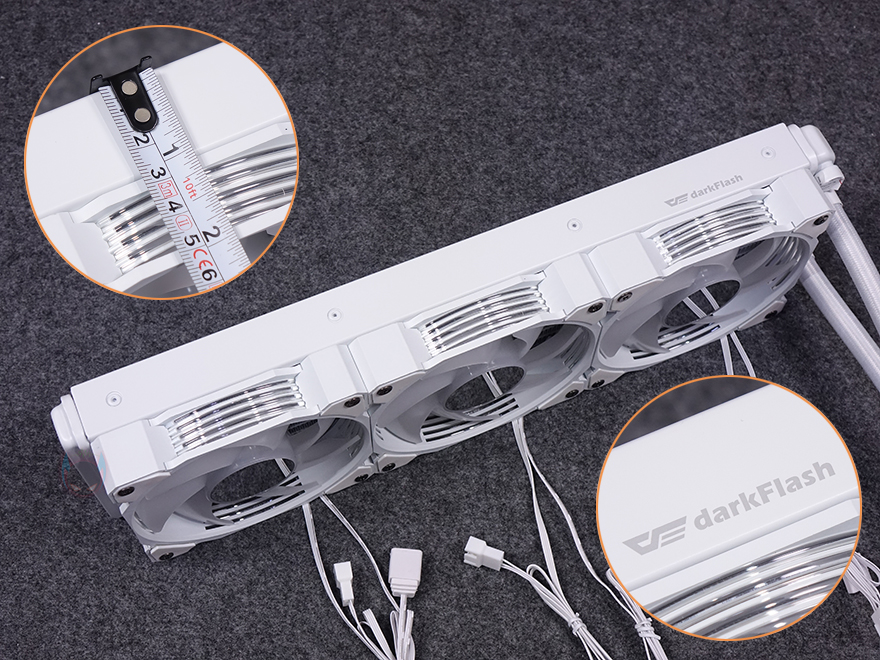 그리고, 팬이 기본 장착된 상태에서 라디에이터와 전체 두께는 약 52mm로 팬 두께가 25mm이고, 라디에이터가 27mm인 전형적인 사이즈임을 알 수 있습니다. 또한, 라디에이터 한쪽 측면에는 darkFlash 로고를 새겨놨으며, 라디에이터 핀은 휘거나 찌그림 없이 일정 간격으로 잘 정렬되어 있습니다. 라디에이터와 워터블록을 잇는 튜브 길이는 약 450mm이며, 튜브 재질은 LR(합성 천연고무) + EPDM(에틸렌 프로필렌)으로 최근 일체형 수랭쿨러에서 많이 사용하는 방식입니다. 또한, 튜브를 깔끔하게 정리할 수 있는 홀더도 2개 적용되어 있어서 위치조절로 정리할 수 있고, 양쪽 연결부 역시 누수발생이 생기지 않도록 깔끔하게 마감처리되어 있죠.