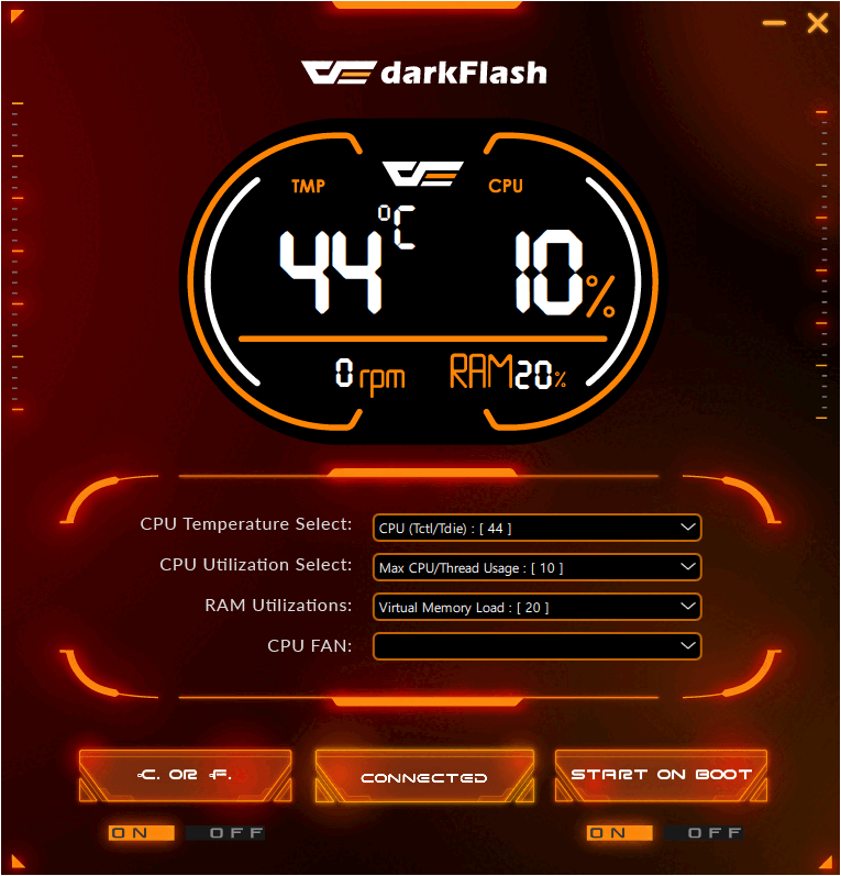 그리고, 모듈식 스크린 디스플레이 같은경우 전용 소프트웨어를 설치해야만 정상적으로 작동하며, 소프트웨어는 다크플래쉬 홈페이지에서 다운로드하여 설치하면 됩니다. 설치 후 프로그램을 실행시키면, 심플한 인터페이스와 함께 화면으로 모니터링할 수 있는 옵션들이 있는데, CPU 온도, CPU 사용률, RAM 사용율, 팬 속도 4가지로, CPU 온도와 사용율은 코어/쓰레드별로도 선택이 가능합니다. 또한 옵션 아래에는 온도 표시를 섭씨(℃)와 화씨(°F)로 표시할지 선택할 수 있고, 부팅 시 프로그램 자동실행 On/Off도 선택할 수 있습니다. 조금 아쉬운 점이라면, 메인보드에 따라서 팬 속도 표기가 나오지 않는 경우가 있어서 호환성이 좀 더 개설될 필요가 있고, 앞서 모듈식 스크린 디스플레이를 간섭발생 시 회전할 수 있다고 언급했듯이, 방향 전환을 하더라도 화면은 전환되지 않기 때문에 사실상 정방향으로 사용하는 것이 가장 보기에 좋습니다.