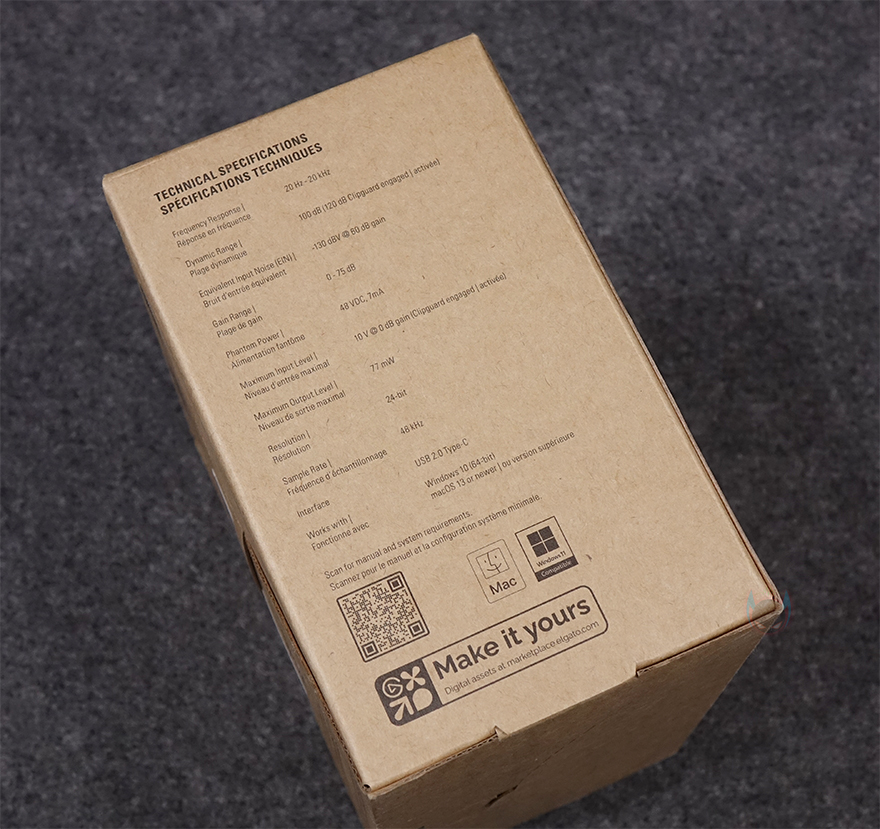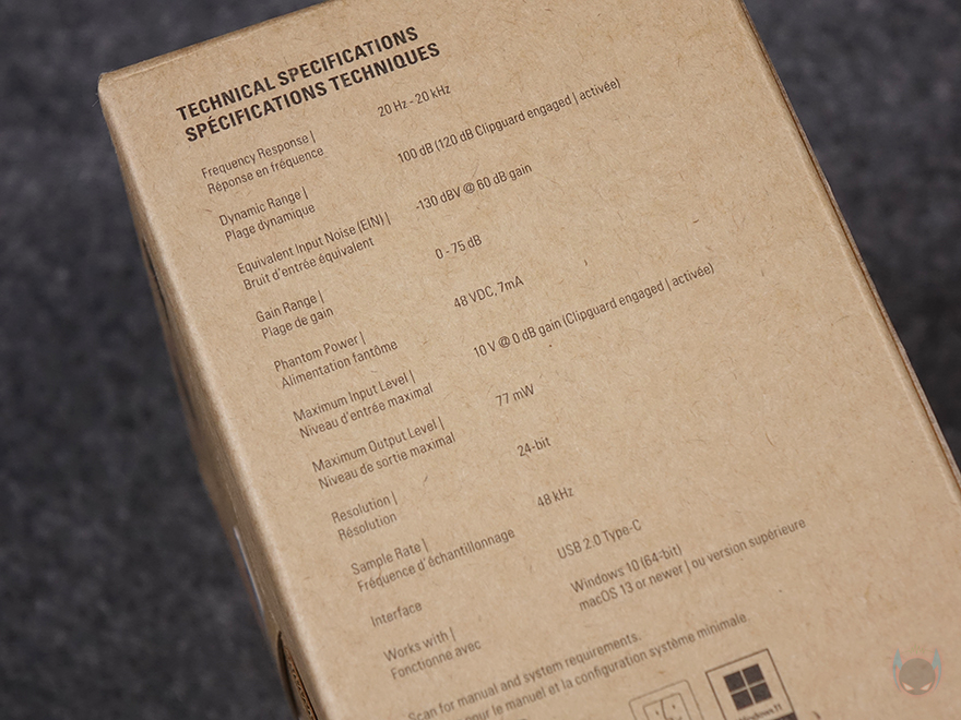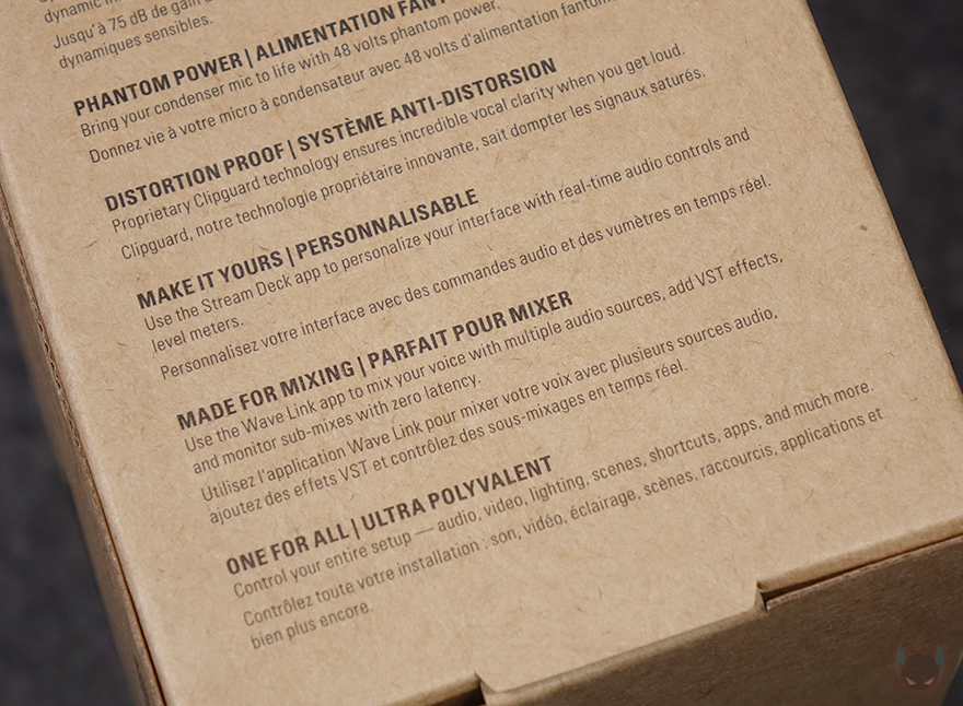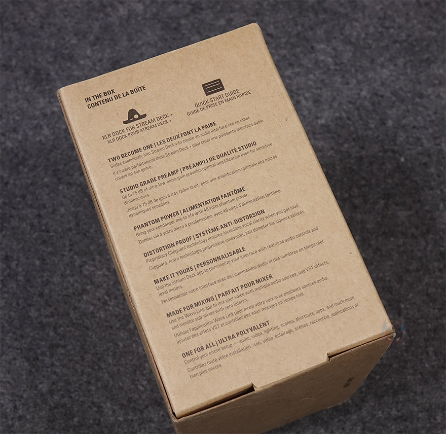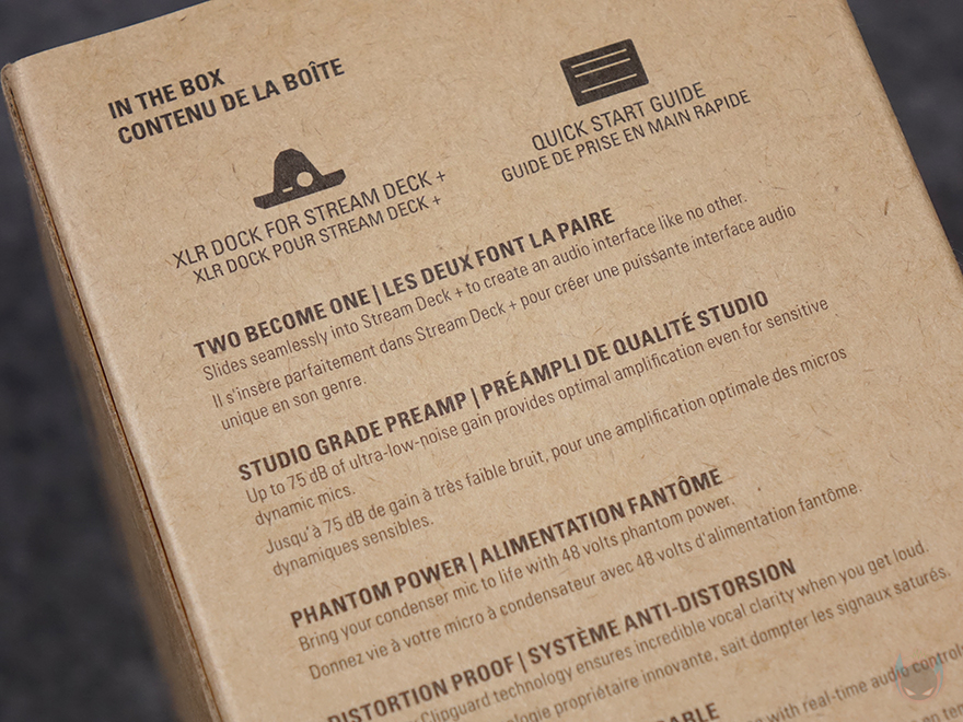 제품 패키지는 박스형태로 XLR Dock은 스트림덱 플러스의 확장 장치 즉 액세서리 제품군에 속하기때문에 박스 디자인은 화려하지 않습니다. 그래도, 전면에 XLR DOCK 모델명과 함께 제품 이미지를 담고 있어서 어떤 장치인지 쉽게 이해할 수 있으며, 박스 한쪽 측면에는 제품에 구성품 목록과 함께 주요 특징을 언급해 놨는데, 스트림덱과 오디오 인터페이스를 하나로 사용할 수 있는 조합, 최대 75dB 게인조절, 팬텀파워 지원, 마이크 왜곡을 최소화해 주는 클립가이드 기술, VST 지원, 낮은 레이턴시 모니터링, 다양한 믹스 인터페이스 구현 등 언급을 확인할 수 있습니다. 반대쪽 측면에는 제품의 기본 사양 표기를 확인할 수 있죠.