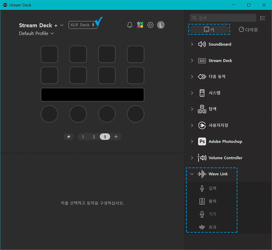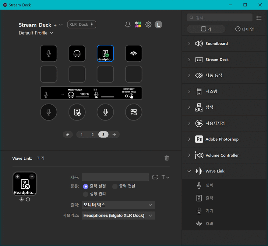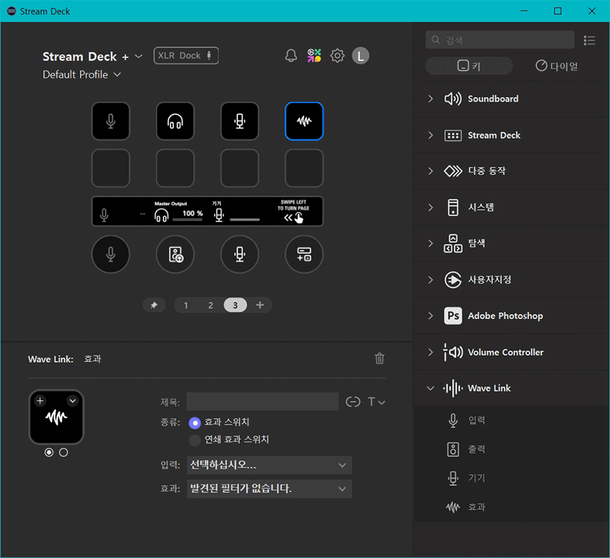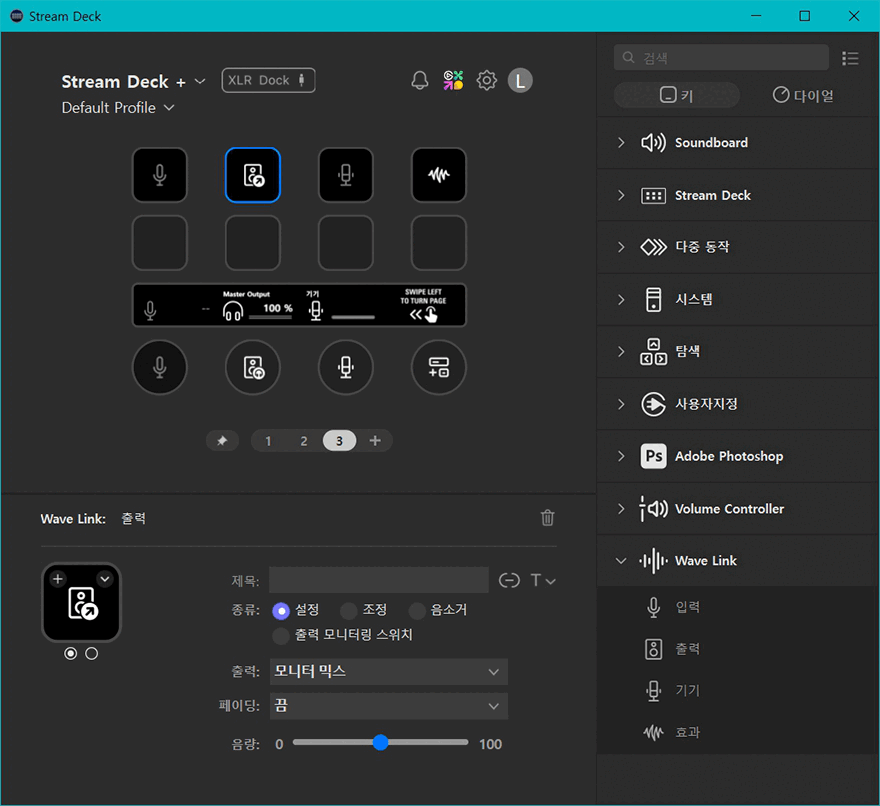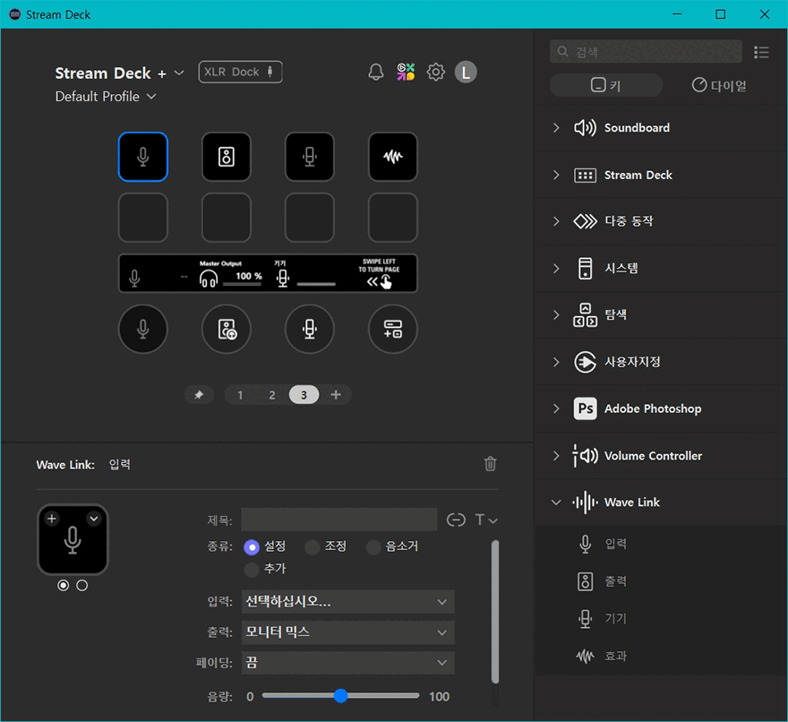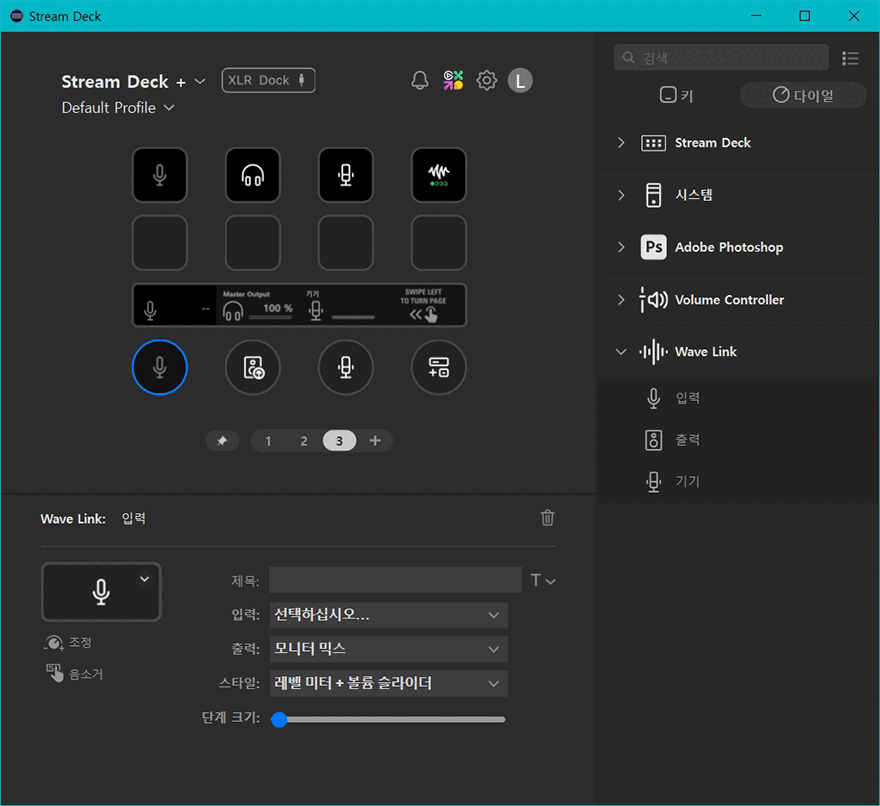 Wave Link 프로그램을 설치한 후에는 이제 스트림덱 플러스에서 연동 사용할 수 있게 Wave Link 플러그인을 추가해줘야 합니다. 플러그인은 엘가토 마켓플레이스에서 추가할 수 있으며, 플러그인이 정상적으로 설치 추가되면, 스트림덱 프로그램 호면에 XLR Dock 표시와 함께 오른쪽 메뉴 구성에서 Wave Link가 탭 버튼 설정의 키 메뉴와 다이얼 설정의 다이얼 메뉴에 추가된 것을 확인할 수 있습니다. 탭 버튼으로는 입력/출력/기기/효과 4가지 메뉴를 선택할 수 있으며, 다이얼로는 입력/출력/기기 3가지 메뉴를 선택할 수 있습니다. 물론, 각 메뉴에는 세부 설정들이 다시 나뉘기 때문에, 스트림덱 플러스 총 8개 탭 버튼에 각 설정된 기능들로 적용해 바로 컨트롤 적용 사용할 수도 있습니다.