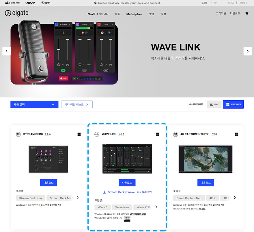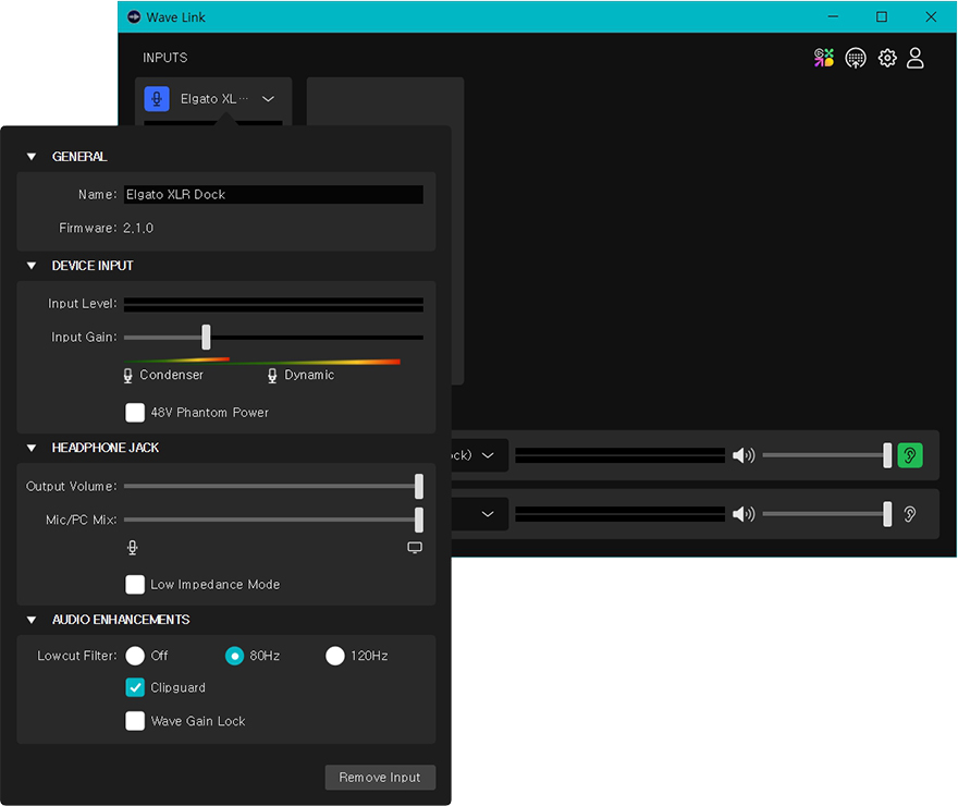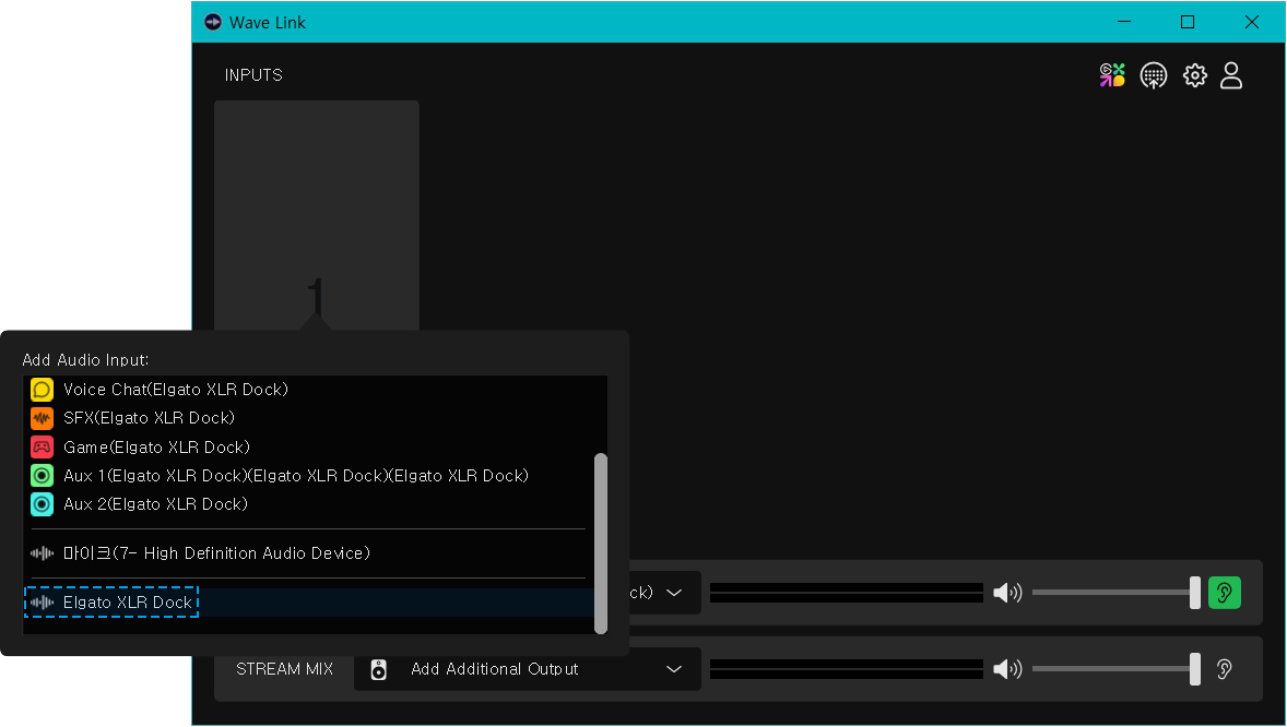 XLR Dock을 스트림덱 플러스와 결합한 후에는 후면 포트에 맞춰서 사용하는 XLR 마이크 케이블, 모니터링 헤드폰 케이블, 스트림덱 플러스에 사용하던 USB 전원케이블을 각각 연결해주면 되고, 마이크는 엘가토 Wave 시리즈 마이크가 아니라도 XLR 연결의 다이내믹이나 콘덴서 마이크면 다 호환 사용이 가능합니다. 그리고, 스트림덱 플러스와 XLR Dock이 결합했기 때문에, 스트림덱 플러스를 통해 XLR Dock에서 사용할 수 있는 엘가토 오디오 인터페이스 프로그램 'Wave Link'와 연동 사용할 수 있습니다. 먼저, Wave Link를 다운로드(https://www.elgato.com/kr/ko/s/downloads) 받아 설치한 후, 실행해서 입력 설정에서 Elgato XLR Dock을 선택하면, XLR Dock에 연결된 마이크와 모니터링 헤드폰을 인식합니다. 마이크 음소거나 볼륨 조절, 모니터링 헤드폰 볼륨조절이 가능하고, 연결한 XLR 마이크가 콘덴서 혹은 다이내믹 마이크인지에 따라 게인(Gain) 조절 범위와 콘덴서 마이크에 사용되는 48V 팬텀파워 On/Off를 할 수 있으며, 저주파수 제거인 로우컷 필터 설정도 할 수 있습니다. 이외에도 Wave Link에서는 다양한 입력 채널을 추가할 수 있는데, 이 부분은 다음 시간 Wave DX 마이크 리뷰를 통해 좀 더 언급하겠습니다.