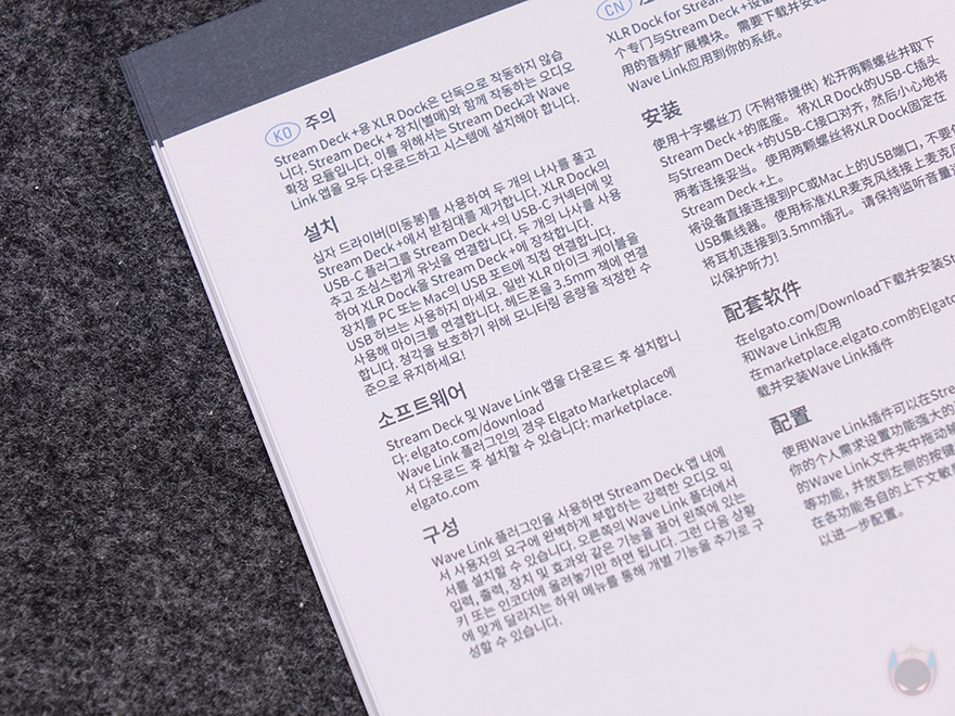 박스를 오픈할때는 아래 PUSH TO OPEN 표기 부분을 누른 후 손잡이를 통해 당기면 절취선에 따라 뜯어지면서 열립니다. 박스를 열어보면 제품 설명서와 함께 커세어 친환경 정책에 따라 종이 포장재에 포장된 XLR Dock을 확인할 수 있으며, 제품 구성은 간단하게 설명서와 XLR Dock만 제공됩니다. 제품 설명서에는 장착 및 사용법을 그림으로 이해하기 쉽게 담고 있으며, 설명란에는 한국어를 포함해 다국적 언어로 설명해 줍니다.