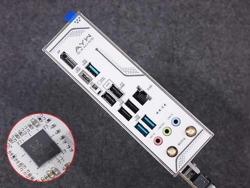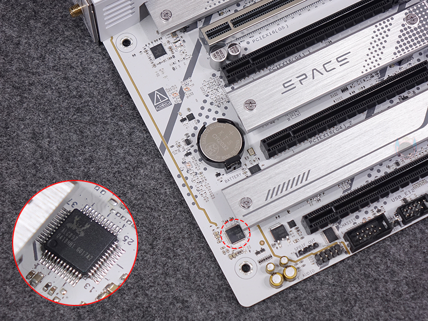 이 밖에 메인보드 맨 아래 오른쪽에는 PC케이스 패널 케이블들과 연결되는 커넥터를 비롯해 나머지 2개의 SATA 6Gbps 커넥터, 추가 USB 3.0 내부 헤더가 배치된 것을 확인할 수 있으며, PCIe 슬롯 기준 메인보드 맨 왼쪽에는 내장 오디오 구간으로 독립 PCB 구간으로 처리되었고, 리얼텍사 칩셋이 사용되었습니다. 끝으로, 백패널 I/O 포트 부분에는 실드가 기본 장착되어 있고, 포트 구성에는 모니터 출력의 디스플레이포트(DP)를 비롯해 USB 3.2 Gen2x2 타입 C포트 1개, USB 3.2 타입 A포트 3개(하늘색), USB 2.0 포트 4개, 2.5 GbE 랜포트, 오디오&마이크 포트, Wi-Fi 안테나와 연결되는 Wi-Fi 6 모듈 안테나 커넥터로 구성되어 있습니다. 참고로, USB 3.2 Gen2x2 타입 C 포트는 DP 겸용으로 사용할 수 있어 모니터 연결이 가능하고, 바로 아래에는 CPU를 장착하지 않고도 바이오스를 업데이트할 수 있는 BIOS FlashBack 버튼이 배치되어 있습니다.