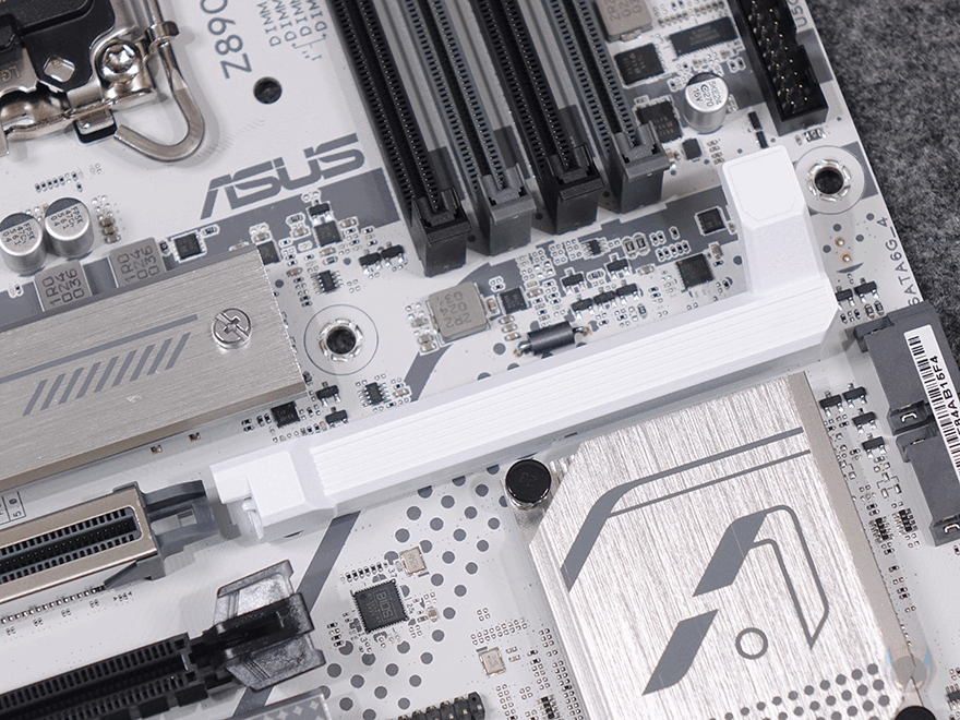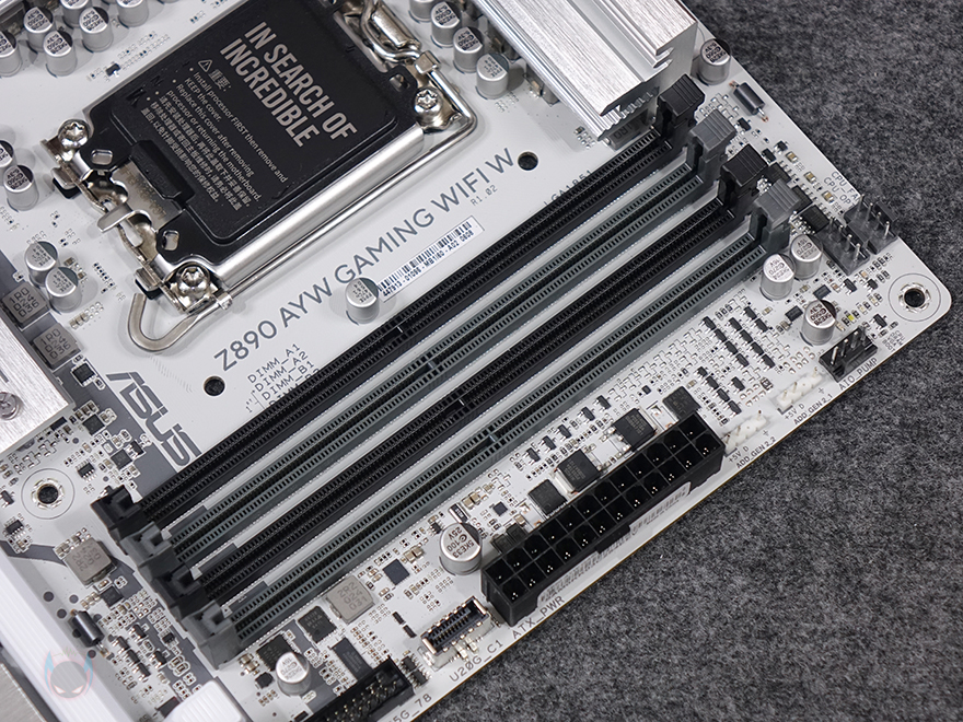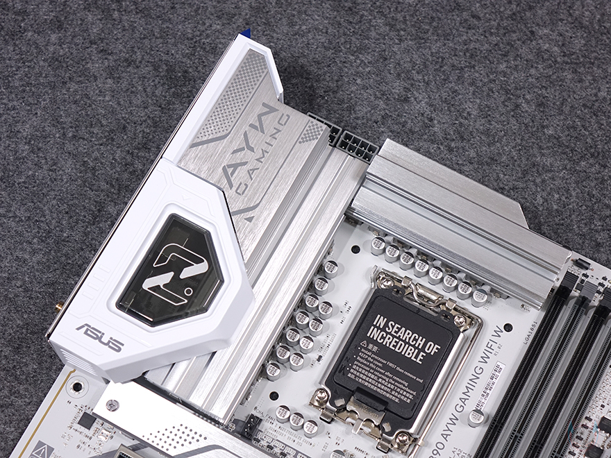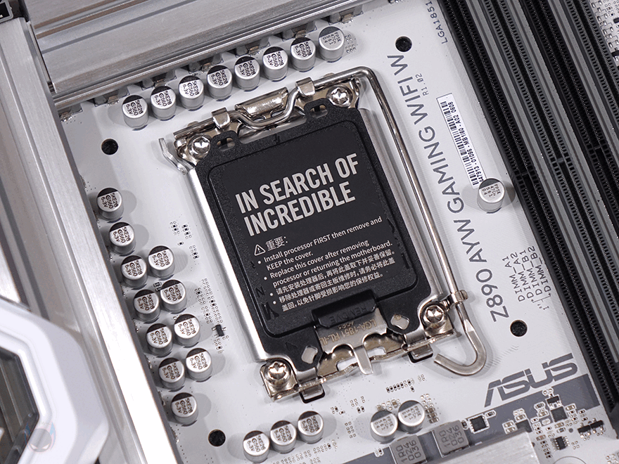 인텔 코어 울트라 시리즈2 CPU 지원의 ASUS Z890 AYW GAMING WIFI W 메인보드를 좀 더 살펴보면, 메인보드 크기는 ATX 폼 규격이며, 한눈에 봐도 화이트 콘셉트라는 걸 알아볼 수 있습니다. 그동안 ASUS 고가형 메인보드에서만 적용되던, 화이트 PCB기판을 적용했고, 방열판 부분도 화이트 계열에 가깝게 메탈 본연의 실버색상으로 갖추고 있죠. CPU가 장착되는 소켓 부분은 개봉 시 핀 보호를 위해 커버가 적용되어 있으며, 소켓 규격은 LGA 1851입니다. 참고로, 이전 세대와 소켓 규격은 바뀌어서 호환되지 않지만, CPU 쿨러 장착 홀은 이전 세대까지였던 LGA 1700과 동일한 위치로 쿨러 호환성을 유지했습니다.