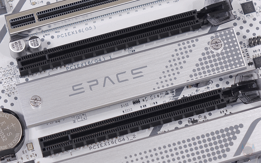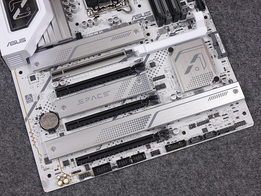 또한, 각 PCIe 슬롯 사이마다 M.2 SSD 슬롯도 배치가 되었는데, 모든 슬롯에 방열판이 장착되어 있으며, 1번 PCIe 슬롯 위에 배치된 M.2 SSD 1번 슬롯은 PCIe 5.0x4 규격까지 지원하며, 22110/2280 사이즈를 장착할 수 있고, 무나사 방식의 M.2 Q-Latch를 적용했습니다. 2번 PCIe 슬롯 아래에 배치된 M.2 SSD 2번 슬롯은 PCIe 4.0x4 규격까지 지원하며, 역시 무나사 방식의 M.2 Q-Latch를 적용했고, 3번과 4번 PCIe 슬롯 사이에는 M.2 SSD 3번과 4번이 각각 배치되어 있으며, PCIe 4.0x4 규격에 역시 무나사 방식 M.2 Q-Latch를 적용했습니다. 물론, M.2 SSD 각 슬롯에 장착된 방열판 안쪽에는 발열 해결을 위한 써멀패드도 기본 부착되어 있죠.