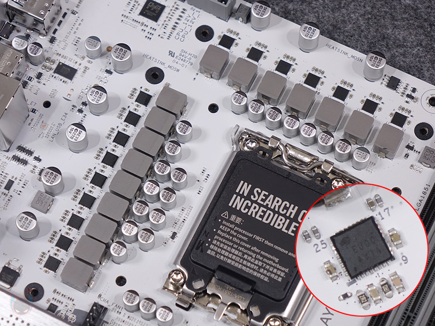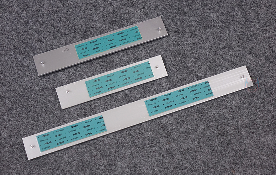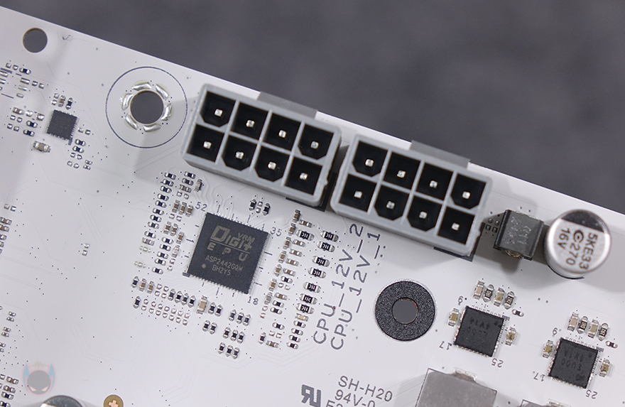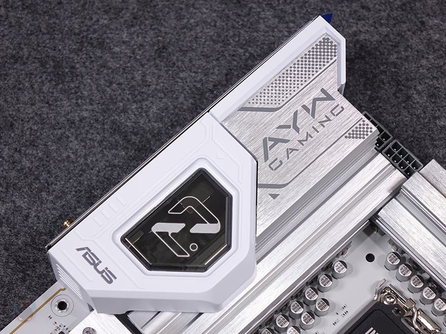 CPU 소켓 주변 전원부에는 발열 해결을 위해 방열판이 장착되어 있으며, 백패널 방향쪽 방열판에는 AYW 로고와 함께 방열판 일부를 가리는 커버 디자인을 함께 적용하고 있는데, 커버에 내부를 살짝 볼 수 있는 윈도우 디자인도 적용되어 있습니다. 방열판을 분리해 전원부를 확인해 보면, 전원부 구성은 12+1+2+1 페이즈 구성으로 총 16-페이즈이며, 모스펫은 Dr.MOS로 개방 최대 80A 전력공급을 지원하며, Alpha&Omega semiconductor사 칩을 사용했고, 전원부 컨트롤러 칩셋은 ASUS Digi+ VRM/EPU 칩을 적용 디지털 전원부로 구성되어 있습니다. 또한, CPU 보조전원도 8핀 2개로 갖추어 CPU 전력 공급을 든든하게 뒷받침해주죠. 물론, 분리된 방열판 안쪽에는 모스펫과 초크 부분에 발열해결을 위해 써멀패드도 기본 부착되어 있습니다.