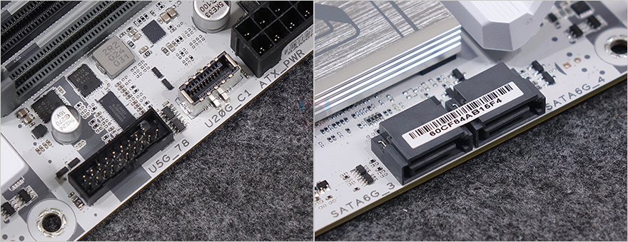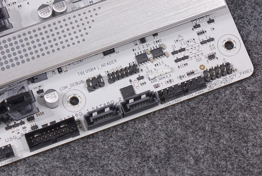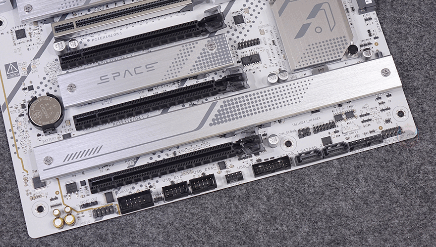 메모리 슬롯은 4개 구성으로 DDR5를 지원하며, DDR5 메모리에서부터 등장하기 시작한 24/48GB의 논-바이너리도 완벽히 지원해 최대 192GB 용량을 갖출 수 있고, 최대 클럭 9066MHz이상을 지원합니다. 슬롯 주변에는 CPU 팬과 수랭쿨러시 워터블록 4핀 커넥터를 비롯해 CPU/메모리/그래픽카드/저장장치가 제대로 인식되는지 확인할 수 있는 Q-LED, 5V ARGB 헤더 2개가 배치되어 있습니다. 그리고, 슬롯 앞자리에 배치된 메인보드 24핀 커넥터 왼쪽에는 USB 3.2 Gen2x2 헤더가 배치되어 있는데, PD 30W 충전도 지원하죠. 또한, 바로 옆에는 USB 3.0 내부헤더가 배치되어 있으며, 같은 라인에서 좀 더 내려가면 측면에서 연결할 수 있는 SATA 6 Gbps 커넥터 2개가 배치되어 있습니다.