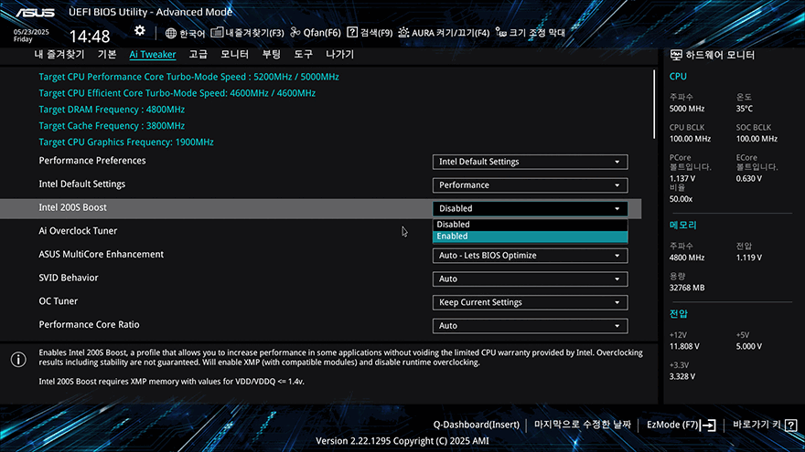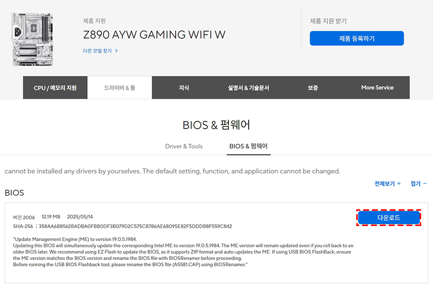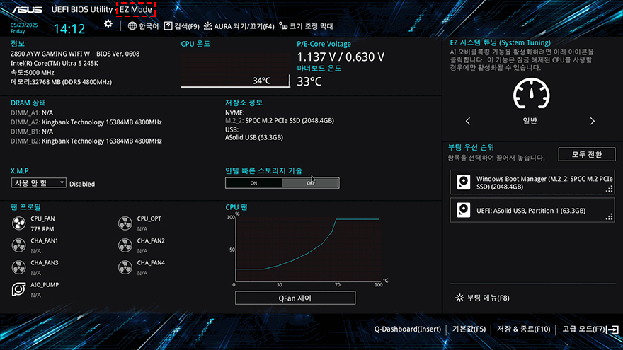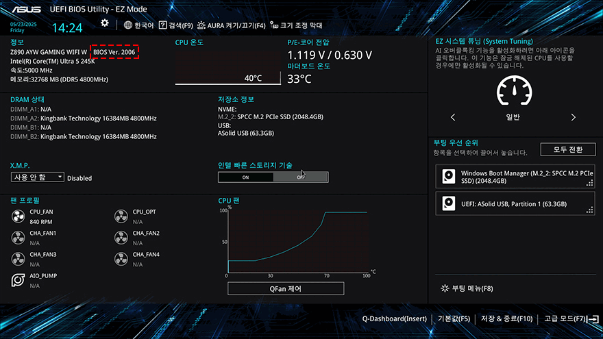 지금까지 인텔 코어 울트라5 시리즈2 245K CPU와 이를 지원하는 Z890 칩셋 기반의 ASUS Z890 AYW GAMING WIFI W 메인보드를 살펴봤으니, 시스템을 갖춰서 성능을 알아봐야 하는데, 그전에 CPU와 메인보드가 정상적으로 작동하는지 안정화 테스트를 해볼 필요가 있습니다. 그래서, 이번 시간에는 안정화 테스트까지만 확인해 볼 텐데, 일단 테스트 전에 메인보드는 항상 최신 바이오스(BIOS) 상태를 유지해 주는 것이 좋습니다. CPU 안정화에도 영향을 주는 동시에 메모리 호환 리스트 추가나 시스템 최적화에도 영향을 주기 때문이죠. 예전에는 일반 소비자가 바이오스 업데이트를 하기에 접근이 쉽지 않았지만, 요즘은 일반 소비자들도 쉽게 바이오스를 업데이트할 수 있을 정도로 편리해졌는데, 일단 ASUS 홈페이지에서 해당 모델 페이지 나오는 최신 버전의 바이오스를 다운로드하여 USB 메모리에 담습니다. 앞서 이번 체험단에 USB 메모리가 제공된 이유는 바로 이 바이오스 업데이트에 사용되기 때문이죠. 바이오스 파일을 담은 USB 메모리는 메인보드 백패널 후면 포트에 BIOS 표시가 된 USB 2.0 포트에 꽂은 후, 부팅과 함께 F2 또는 Delete키를 눌러 바이오스 CMOS 화면에 진입합니다. ASUS 메인보드 같은 경우에는 CMOS 화면에서 F7키를 누르면 EASY MODE와 ADVANCED MODE로 전환할 수 있는데, ADVANCED MODE로 전환해서 도구 메뉴로 이동해 첫 번째인 바이오스 업데이트 프로그램 'EZ 플래시 4 유틸리티'를 선택합니다. 그럼, 탐색기 화면으로 전환되고, 탐색기 경로에서 USB 메모리는 선택▶USB 메모리 안에 있는 바이오스 업데이트 압축파일을 선택하면, 순차적으로 안내문구가 나오고, YES를 선택해 넘기면서 최종적으로 업데이트 진행 확인 메시지가 나옵니다. 메시지에서 YES를 선택하면, 이후부터는 자동으로 업데이트가 진행되고, 업데이트를 마친 후에는 재부팅과 함께 CMOS 화면으로 들어와 EASY MODE에서 메인보드 모델명 표기 옆에 바이오스 최신 버전을 확인할 수 있죠. 업데이트된 바이오스 버전까지 확인했으며, F5키를 눌러서 기본 설정값을 불러오고, F10키를 눌러 저장 후 재부팅을 하면 기본 PC 시스템 설정은 마무리가 됩니다.