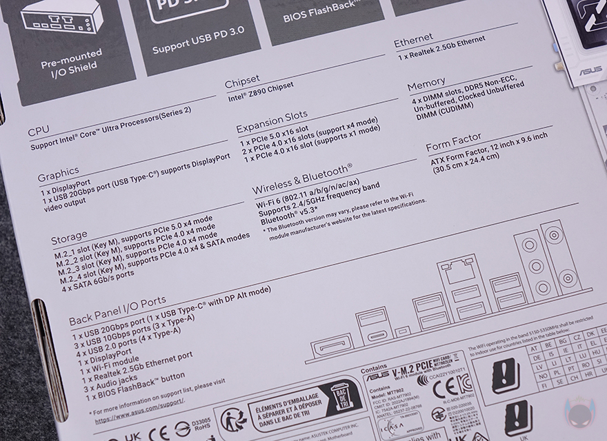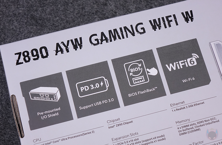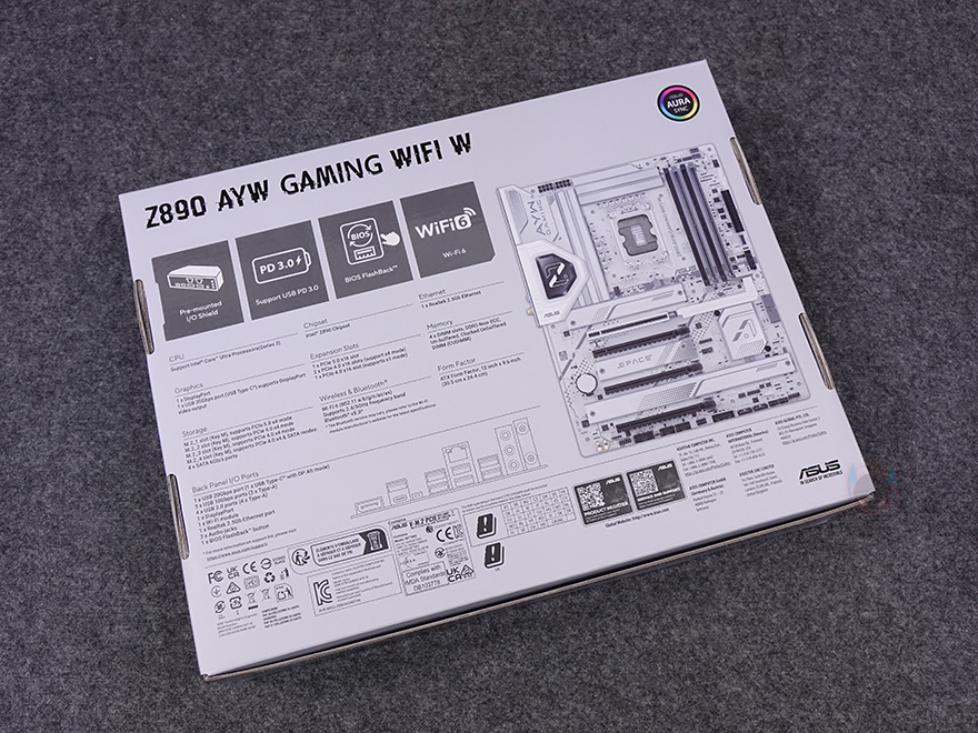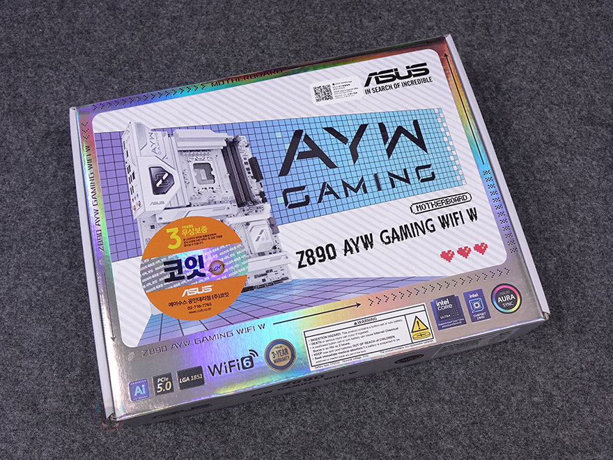 메인보드 같은경우에는 코어 울트라 시리즈2 CPU 출시와 함께 이를 지원하는 인텔 칩셋 Z890/B860/B810 메인보드 제품들이 나왔는데, 이번 체험에 사용되는 CPU가 오버클럭 지원의 K버전이기 때문에 메인보드 역시 CPU와 메모리 오버클럭 둘 다 지원하는 Z890칩셋 기반의 제품으로 사용되고, 제공되는 메인보드는 ASUS의 Z890 AYW GAMING WIFI W 모델입니다. AYW는 'As You Wish' 약자로 ASUS에서 가장 치근에 새롭게 추가된 라인업이죠. 기존의 PRIME 라인업과 TUF 라인업의 중간 위치라고 보면 됩니다. 최근 TUF 라인업에 블랙 콘셉트로 자리 잡으면서 사실상 화이트 콘셉트로 새 라인업이 생긴 거라고 보면 됩니다. 그래서, 제품 박스부터 살펴보면, 박스 디자인도 화이트를 배경으로 하고 있으며, 모델명과 함께 인텔 코어 울트라 시리즈2 지원, Z890칩셋 표기를 확인할 수 있고, ASUS 메인보드 국내 정식수입사 중 하나인 코잇의 3년 무상보증 스티커도 추가로 확인할 수 있죠. 박스 후면에는 제품 풀-샷 이미지를 담고 있어서 제품이 화이트 콘셉트라는 걸 미리 알 수 있으며, 이미지 옆에는 주요 특징과 제품의 기본 사양, 그리고 백패널 I/O 포트 구성 표기를 해놨습니다.