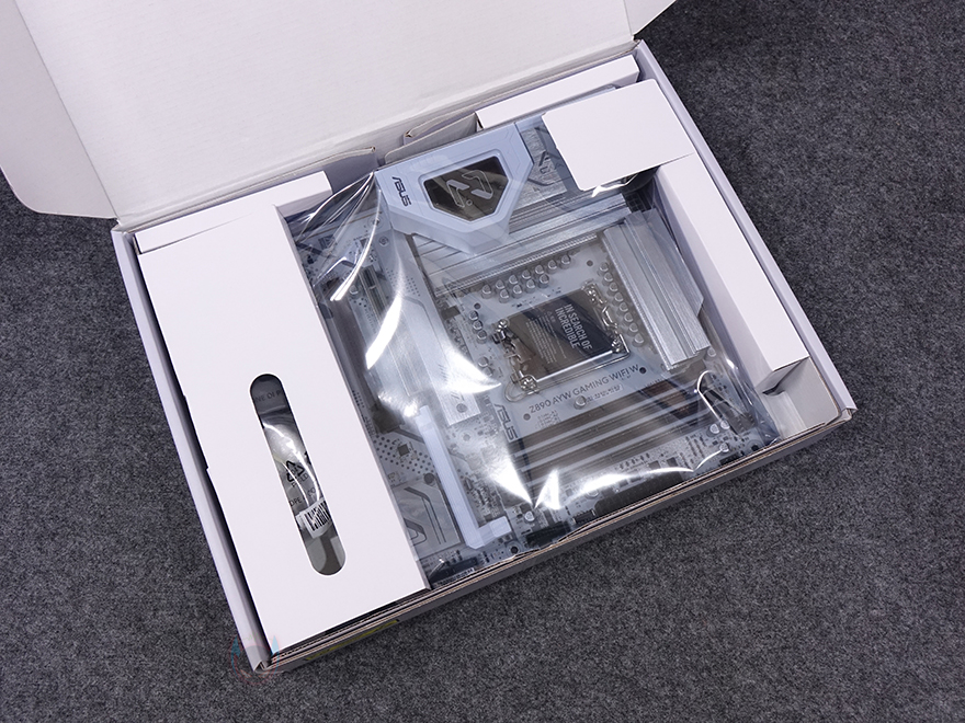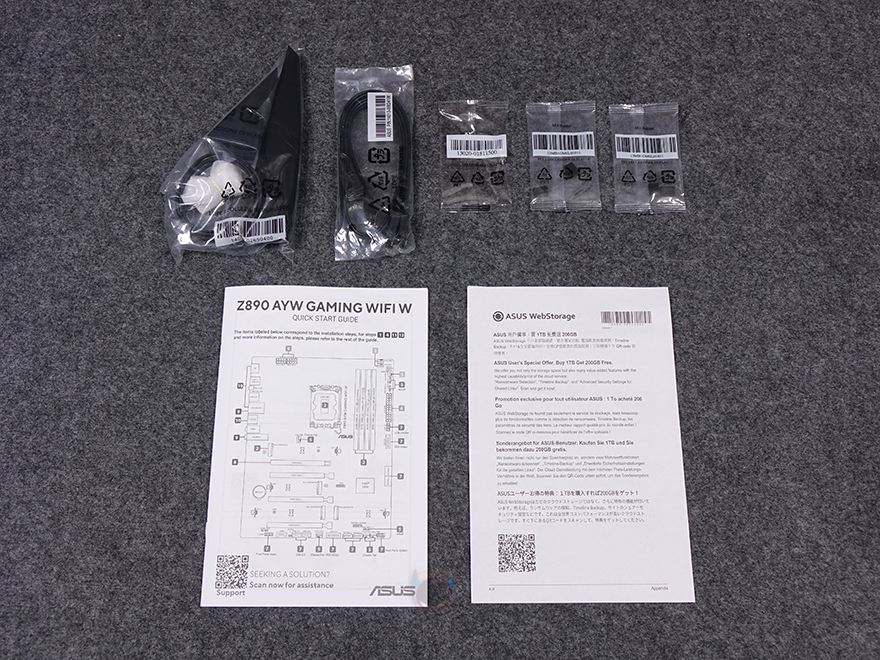 박스를 열어보면, 기본 메인보드 포장은 정전기방지 보호비닐 포장을 하고 있으며, 제품 설명서 및 안내서를 제외한 나머지 Wi-Fi 안테나, SATA 케이블, M.2 SSD 패드 및 나사 구성품들도 각개 포장으로 처리되어 있습니다.