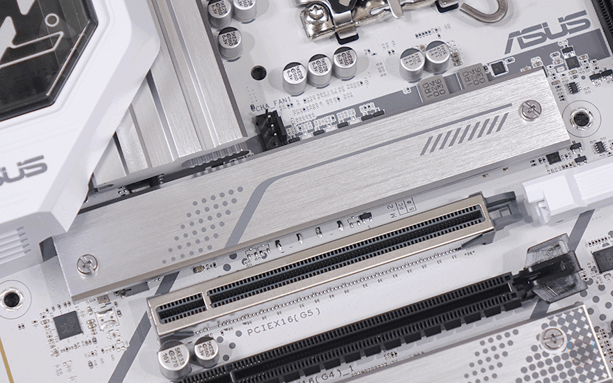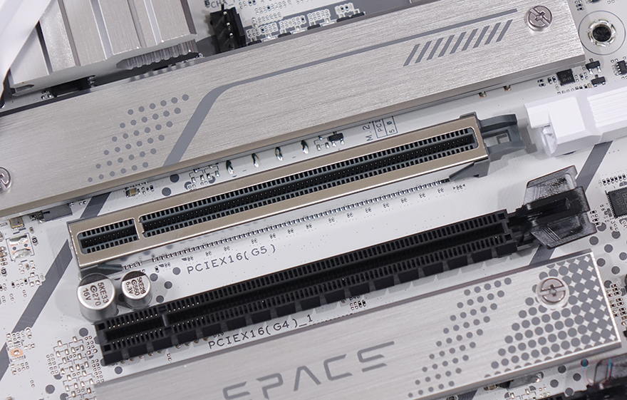 PCIe 슬롯은 총 4개를 갖추고 있는데, 그래픽카드가 장착되는 1번 슬롯은 내구성 강화를 위해 스틸 커버의 세이프슬롯 디자인을 적용했으며, 슬롯 맨 오른쪽에는 일반적으로 그래픽카드를 장착할때 고정해 주는 걸쇠가 없습니다. 대신에 그 옆으로 길게 메모리 슬롯 근처까지 이어지는 레버가 있는데, 바로 손쉽게 그래픽카드를 탈거할 수 있는 Q-릴리즈 장치를 적용했죠. 지렛대처럼 누르면 손쉽게 그래픽카드를 분리할 수 있습니다. 그리고, 1번 슬롯은 PCIe 5.0x16 배속, 그 아래 2, 3번 슬롯은 PCIe 4.0x16(4배속), 마지막 4번 슬롯은 PCIe 4.0x16(1배속) 규격을 적용했습니다.