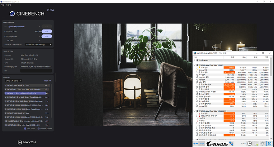 30분간 렌더링 테스트를 통해 안정화를 진행한 결과, 정상적으로 통과되는 것을 확인할 수 있으며, CPU의 온도도 공랭쿨러로 약 78℃ 수준으로 무난한 편임을 확인할 수 있습니다. 참고로 씨네벤치 R24 멀티코어 점수는 1483점으로 나왔고, 이는 코어 울트라5 시리즈2 245K CPU에서 볼 수 있는 평균 점수대입니다. 안정화 테스트까지 마치고, 좀 더 성능을 끌어올리고 싶다면, CMOS 화면에서 Intel 200S Boost 옵션을 비활성화시키고, 수동으로 P-코어와 E-코어 배수 설정을 하면 됩니다. 최근 CPU들은 기본 설정으로 사용해도 부스트클럭이 높게 작동하기 때문에 예전만큼 오버클럭 수율이 높은 편은 아니라 수동 오버클럭을 통해서 높은 성능을 기대하기는 어렵지만, Intel 200S Boost 옵션보다는 좀 더 성능이 올라가는걸 확인할 수 있어 사용하는 소비자가 선택하면 되겠습니다. 그럼, 이번 시간 코어 울트라5 시리즈2 245K CPU를 살펴보는 시간으로 여기까 지로 하고, 다음 시간부터는 시스템을 최종적으로 구성해 게임과 작업 성능을 확인해 보는 시간을 가져보도록 하겠습니다.