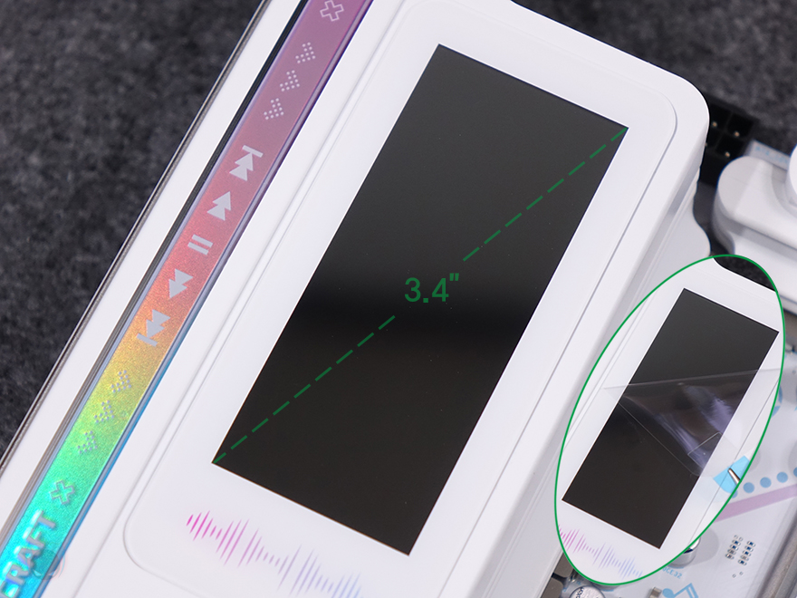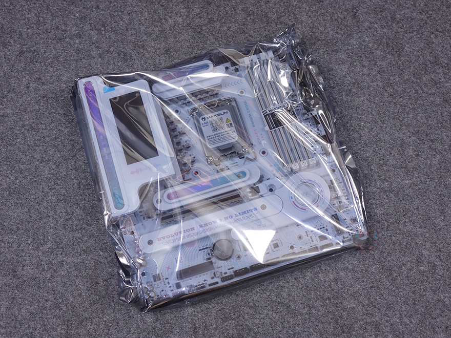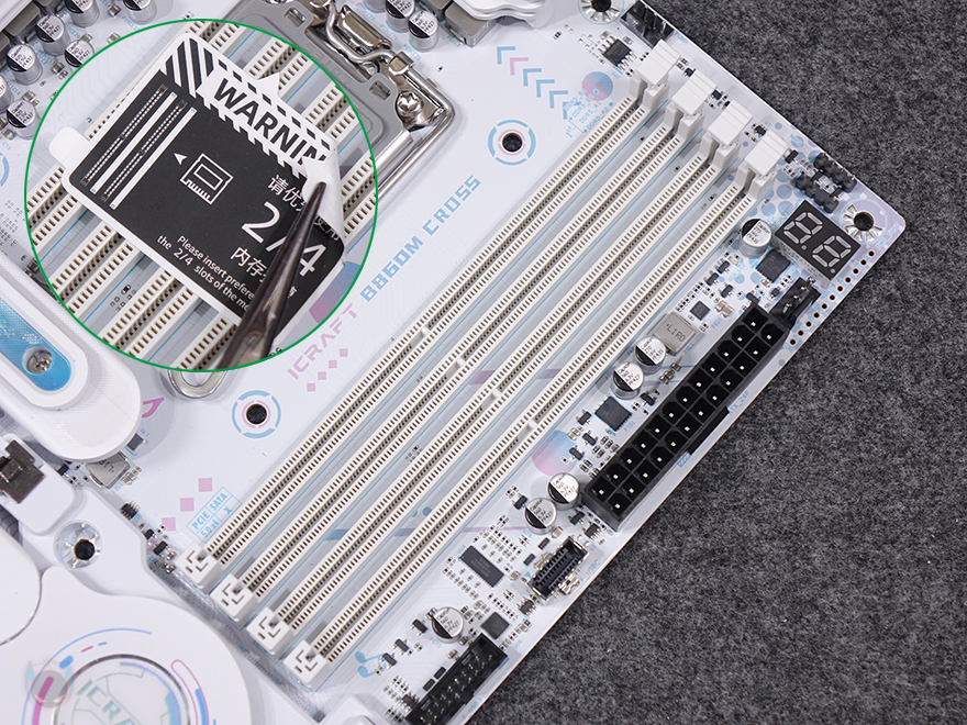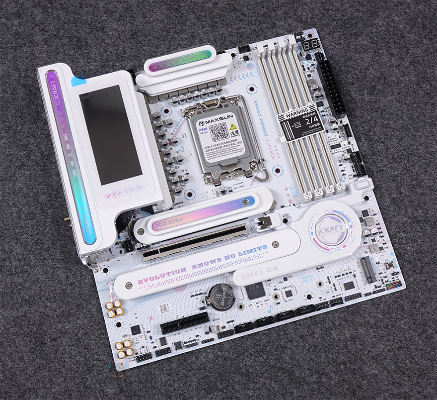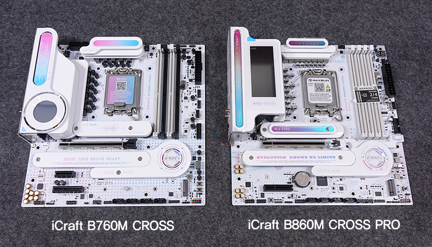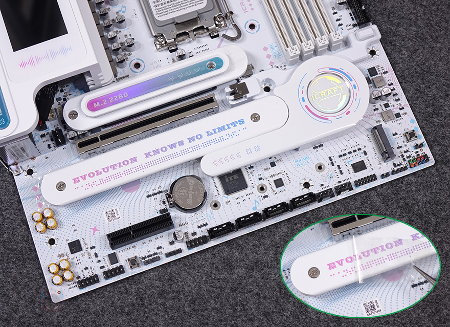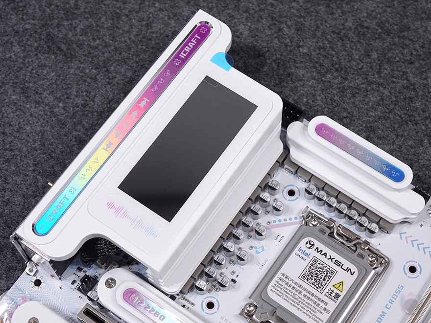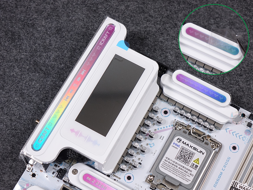 위치별로 좀 더 자세히 살펴보면, 개봉시 CPU 소켓 부분에는 보호캡이 적용되어 있으며, 인텔 코어 울트라 시리즈2(Intel Core Ultra Series2) CPU를 지원하기 때문에 LGA 1851 소켓규격을 가졌으며, 쿨러가 장착되는 홀-부분은 기존 LGA 1700과 동일해 쿨러 호환성은 유지되었습니다. CPU 주변 전원부는 이 제품의 가장 큰 특징으로 전원부 위치에 방열판(Heatsink)이 기본 장착되어 있으며, 이전 모델과 마찬가지로 화이트 색상의 방열판에 포인트로 빛 반사에 따라 색상이 다르게 보이는 홀로그램 디자인을 적용하고 있습니다. 또한, 백패널 방향 쪽 전원부에 장착된 방열판에는 앞서 제품 박스에서 잠깐 언급했듯이 자사 상위 플래그십 메인보드에 적용된 3.4인치 LCD 디스플레이를 적용하고 있으며, 뒤에서 확인하겠지만, 다양한 배경 이미지와 함께 시스템 모니터링을 할 수 있죠. 참고로, iCraft B860M CROSS 기본 모델과 프로 모델의 가장 큰 차이점은 바로 이 디스플레이 부분입니다. 그리고, 개봉 시 방열판과 디스플레이에는 보호비닐이 부착되어 있기 때문에 제거를 해줘야 합니다.
