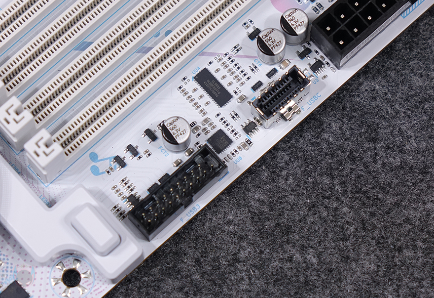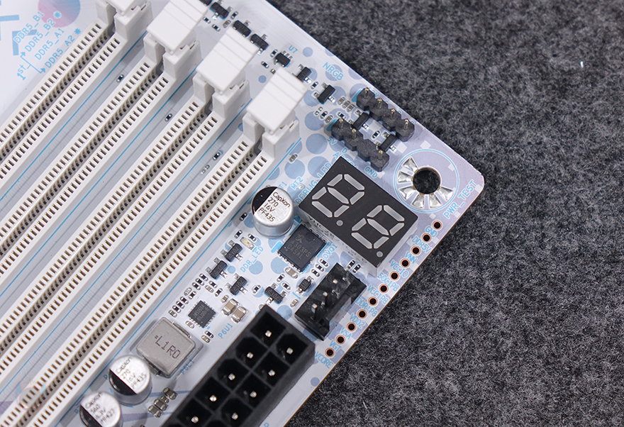메모리 슬롯은 4개 구성으로 개봉 시 듀얼 채널 장착 구분을 알려주는 스티커가 부착되어 있으며, 사용전에 제거하면 됩니다. 그리고, 이전 세대에선 듀얼 채널 구분이 되도록 2개를 블랙 색상으로 적용했지만, 이번 iCraft B860M CROSS PRO와 기본 모델에서는 모두 화이트 색상 슬롯으로 통일했죠. 메모리 규격은 DDR5를 지원하고, 홈페이지에 현재까지 등록된 메모리 호환리스트 기준으로 클럭은 9200MHz까지 지원하고 있으며, 24/48GB 논-바이너리 용량까지 완벽 지원해 최대 192GB 용량을 구상할 수 있습니다. 메모리 슬롯 주변에는 부팅 상태를 확인할 수 있는 디버그 LED와 메모리 정상 작동을 확인할 수 있는 LED, 그리고, 12V RGB와 5V ARGB 헤더가 배치된것을 확인할 수 있으며, 플래그쉽 메인보드에서나 볼 수 있는 전압 측정 프로브 포인트까지 적용되어 있습니다. 또한, 슬롯 앞부분에 배치된 메인보드 24핀 전원 커넥터 옆에는 USB Type-C 내부헤더가 배치되어 있는데, USB 3.2 Gen2x2 규격으로 20Gbps를 지원하며, 바로 옆에는 USB 3.0 헤더가 배치되어 있죠.