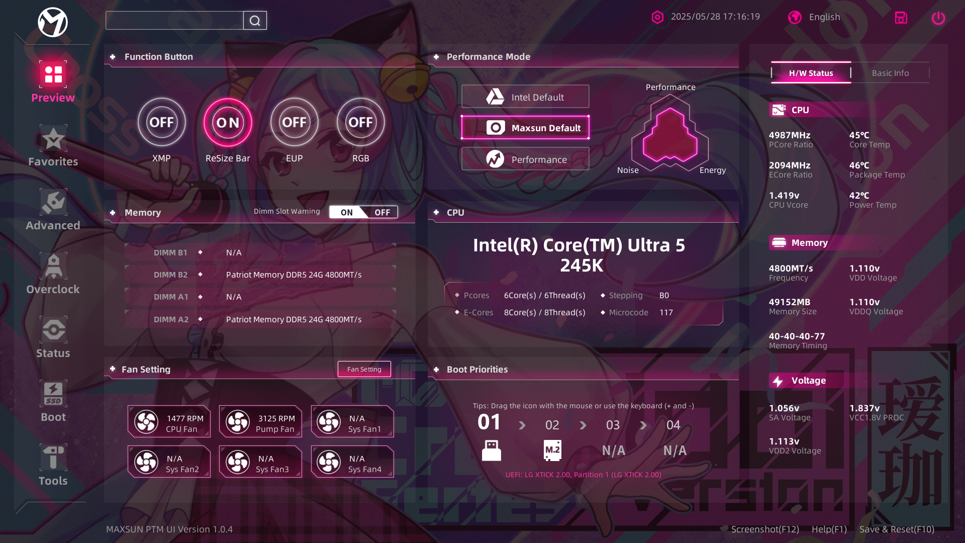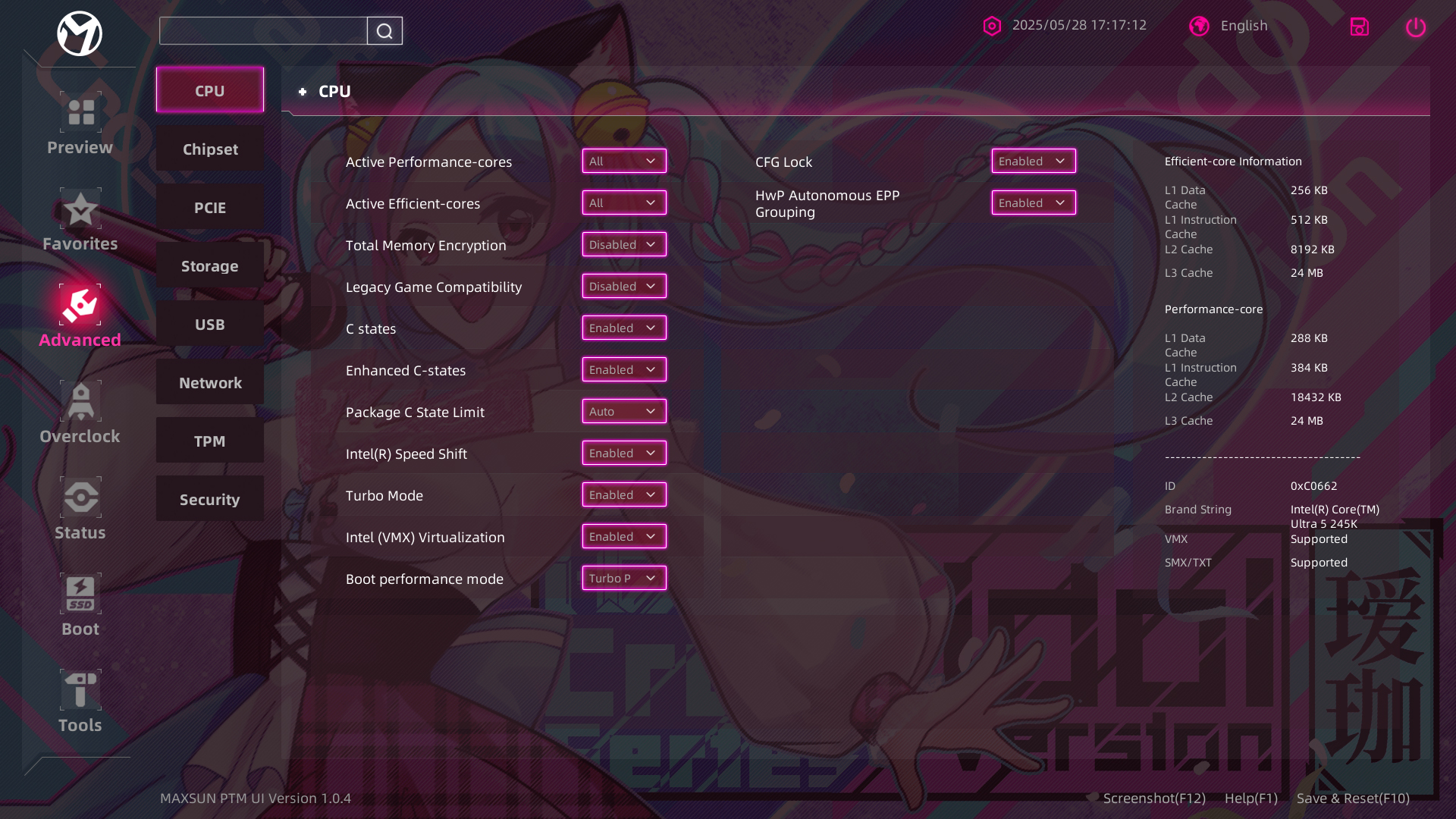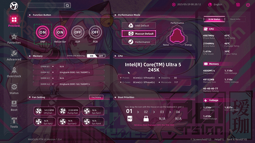 iCraft B860M CROSS PRO 메인보드의 바이오스(BIOS) CMOS 화면으로 들어가 보면, CMOS GUI 디자인 역시 자사 플래그십 메인보드에서 선보였던 모바일 앱에서 영감을 얻은 PMT 디자인을 적요하고 있는 동시에 화면 배경도 iCraft CROSS 캐릭터 디자인을 적용하고 있습니다. 맨 왼쪽에 메인 메뉴로 Preview, Favorites, Advanced, Overclock, Status, Boot, Tools 7가지 메뉴를 확인할 수 있으며, Preview에서는 한눈에 XMP나 성능 모드 전환을 비롯해 주요 시스템 상태와 팬, 부트 설정으로 바로 갈 수 있으며, Advanced에서는 CPU를 비롯해 칩셋, 저장장치, USB, 네트워크 등 메인보드 세부 하드웨어 부분을 설정할 수 있습니다. Overclock에서는 CPU 오버클럭을 지원하는 건 아니지만, 배수나 메모리 오버클럭, 전압 설정을 다룰 수 있으며, Status는 시스템 모니터링, Boot는 부팅 설정, 마지막 Tool은 사용자가 설정해 놓은 프로파일은 저장/불러오기 및 바이오스 업데이트를 할 수 있죠.
