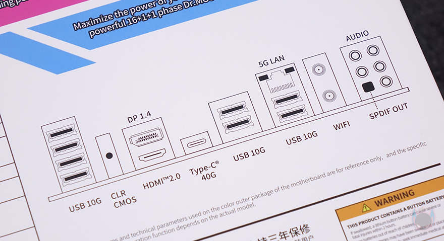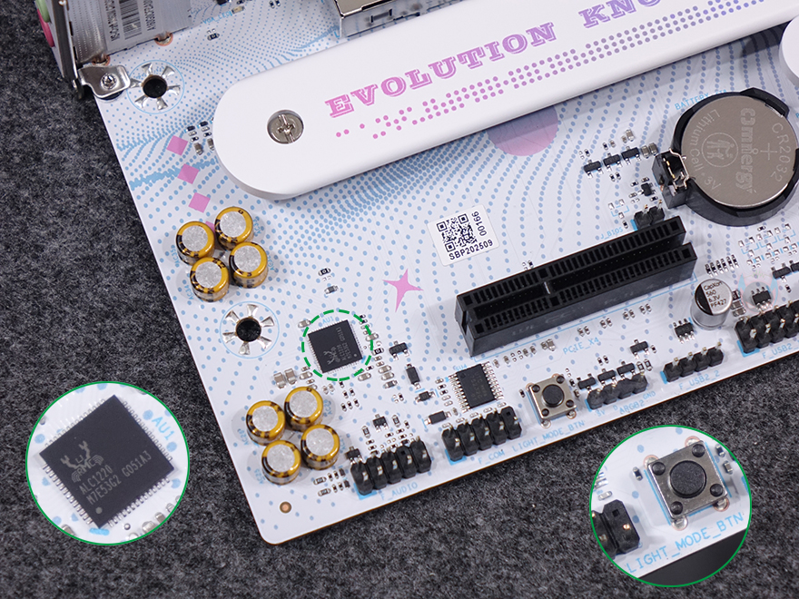 나머지 PCIe 4.0x4 슬롯 주변에는 내장 오디오 칩셋으로 리얼텍(Realtek) 칩셋이 배치된 것을 확인할 수 있으며, 슬롯 바로 아래에는 추가 5V ARGB 헤더와 함께 바로 옆에 라이트닝효과 모드를 변경할 수 있는 온보드 버튼이 배치되어 있습니다. 끝으로, 백패널 I/O 포트 부분에는 실드가 기본 장착되어 있으며, 포트 구성에는 USB 10 Gbps 포트가 무려 10개가 배치되어 있고, 모니터 출력 포트에는 HDMI 2.0과 DP 1.4 포트가 배치되어 각각 4K@60Hz, 4K@120Hz 해상도를 지원합니다. 또한, 모니터 출력포트 바로 위에는 CMOS 클리어(Clear) 버튼도 적용되어 있으며, 아래에는 USB 4.0 타입 C포트도 적용되어 있는데, 15W 충전도 지원하죠. 이외에도 이전 세대 모델에서 2.5Gb로 적용되었던 랜포트는 5G 랜포트로 상향되었고, 무선 Wi-Fi 모듈도 이전 세대에선 Wi-Fi 6E였다면, 이번 모델에선 상향되어 Wi-Fi 7을 갖추고 있으며, 안테나 연결부분도 나사 방식이 아닌 바로 꽂았다 뺄 수 있는 방식입니다. 물론, 안테나도 기본 제공되는데 안테나 디자인도 제품 콘셉트에 맞춰 화이트 색상으로 통일했습니다. 그리고, 백패널 I/O 맨 아래에는 오디오 포트들이 배치되어 있습니다.