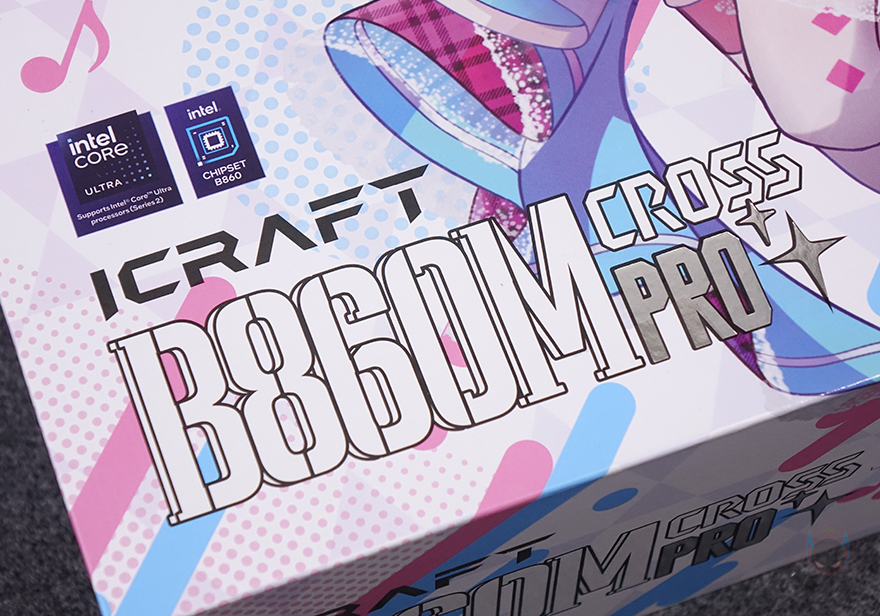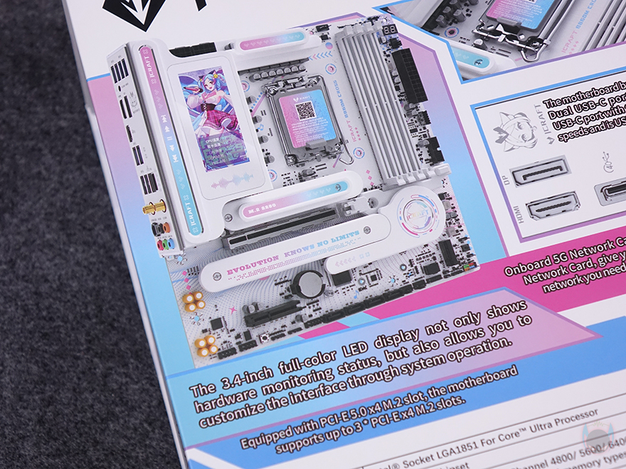 제품 박스부터 살펴보면, 박스 디자인은 이전 세대인 인텔 B760칩셋 기반의 iCraft B760M CROSS와 동일합니다. 물론, 박스에 담긴 제품 정보 내용들은 칩셋이 바뀌었기 때문에 다르죠. 그리고, iCraft CROSS 시리즈의 콘셉트는 캐릭터 디자인으로 iCraft B860M CROSS PRO 박스 전면에 캐릭터 Aijia를 이번에도 담고 있습니다. 또한, 아래에는 인텔 코어 울트라 시리즈2 CPU 지원과 인텔 B860칩셋 표기와 함께 모델명을 확인할 수 있죠. 박스 후면에는 제품에 관한 정보를 좀 더 상세하게 담고 있는데, 왼쪽에는 제품 풀-샷 이미지와 함께 자사의 Z890칩셋 기반 iCRAFT Z890 ARCTIC/VERTEX/PACIFIC 플래그십 모델에 적용되었던 3.4인치 LCD 디스플레이를 언급하고 있으며, 바로 오른쪽에는 주요 특징으로 메모리 지원과 PCIe 5.0x16 지원, 전원부, USB 4.0 포트 및 5G 랜 포트 지원을 언급하고 있습니다. 바로 아래에 백패널 포트 표기를 해놨기 때문에 쉽게 이해가 되는데, B860칩셋 기반에서 USB 4.0 포트 지원은 흔하지 않기 때문에 이 제품에 상당히 신경 썼다는 것도 알 수 있죠. 그리고, 바로 옆에는 제품의 기본 사양도 표기를 해놨습니다.