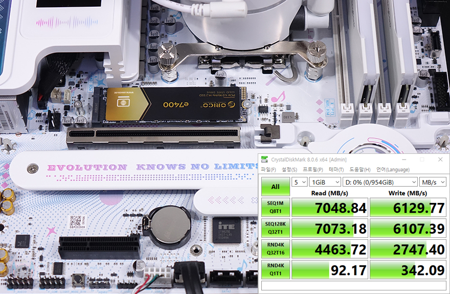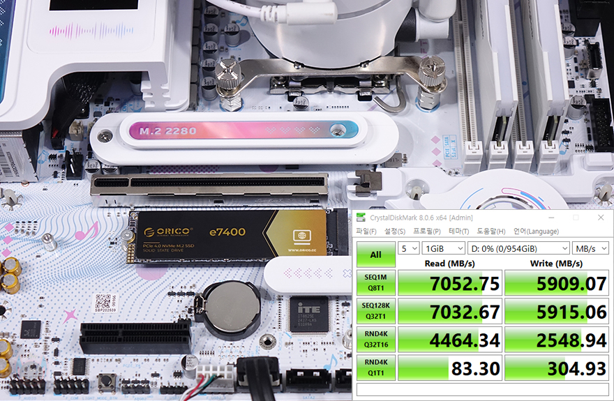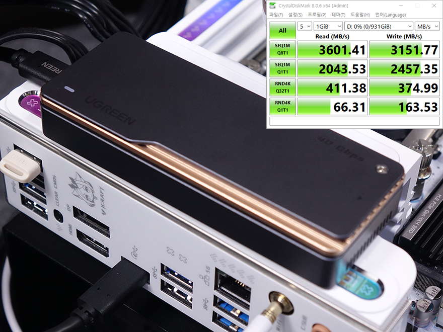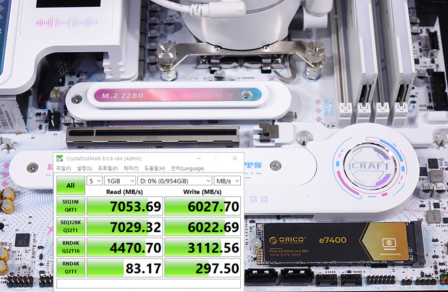 SSD 저장장치(Storage) 같은 경우에는 앞서 레이아웃에 확인했듯이 총 3개의 M.2 SSD 슬롯을 갖추고 있습니다. 1번은 PCIe 5.0x4 규격을 지원하지만, 아직 가격대가 높은 편이기 때문에 소비자들은 대중적으로 PCIe 4.0x4 SSD를 가장 많이 사용하죠. 그래서, PCIe 4.0x4 규격의 NVMe SSD를 사용해 각 슬롯에서 속도 성능을 확인해 봤는데, 모두 PCIe 4.0x4 규격에서 볼 수 있는 읽기 7000MB/s 대와 쓰기 6000MB/s대로 발휘되는 걸 확인할 수 있습니다. 또한, iCraft B860M CROSS PRO 메인보드는 B860 메인보드임에도 백패널 후면에 USB 4.0 포트를 갖추고 있습니다. 그래서, USB 4.0 지원의 외장 SSD를 사용하게 되면 기존 USB 3.2 Gen2x2보다 더 빠른 속도로 사용할 수 있는데, 실제 USB 4.0 외장 SSD를 장착해 속도확인을 해 본 결과, 읽기와 쓰기 속도 모두 USB 4.0 규격에서 보여주는 3000MB/s 대 속도를 확인할 수 있습니다.