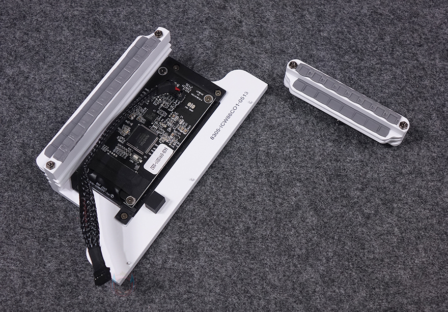 전원부 방열판을 분리해 보면, 안쪽에 전원부 모스펫과 초크 부분 발열해결을 위해 써멀패드(Thermal Pad)가 기본 부착된 것을 확인할 수 있으며, 앞서 언급한 3.4인치 LCD 디스플레이의 내부 기판도 확인할 수 있습니다. 전원부 구성은 16+1+1 페이즈 구성으로 이전 세대 모델보다 CPU 전원공급 페이즈를 더 늘렸으며, 모스펫은 이전 세대와 동일한 개당 50A 전력공급을 하는 Vishay사 칩셋을 사용했고, 전원부 컨트롤러 칩셋 역시 Richtek사 칩셋으로 동일하지만, 이전 세대보다 상위 칩셋을 사용했습니다. 그리고, 주변 캐패시터들 역시 Capxon사 제품을 사용했으며, 보조전원은 8핀 2개로 이전 세대보다 더 강화되었습니다. 그리고, 위와 왼쪽 전원부 배열 중간 위치에는 CPU 작동상태를 확인할 수 있는 LED도 적용되어 있죠.